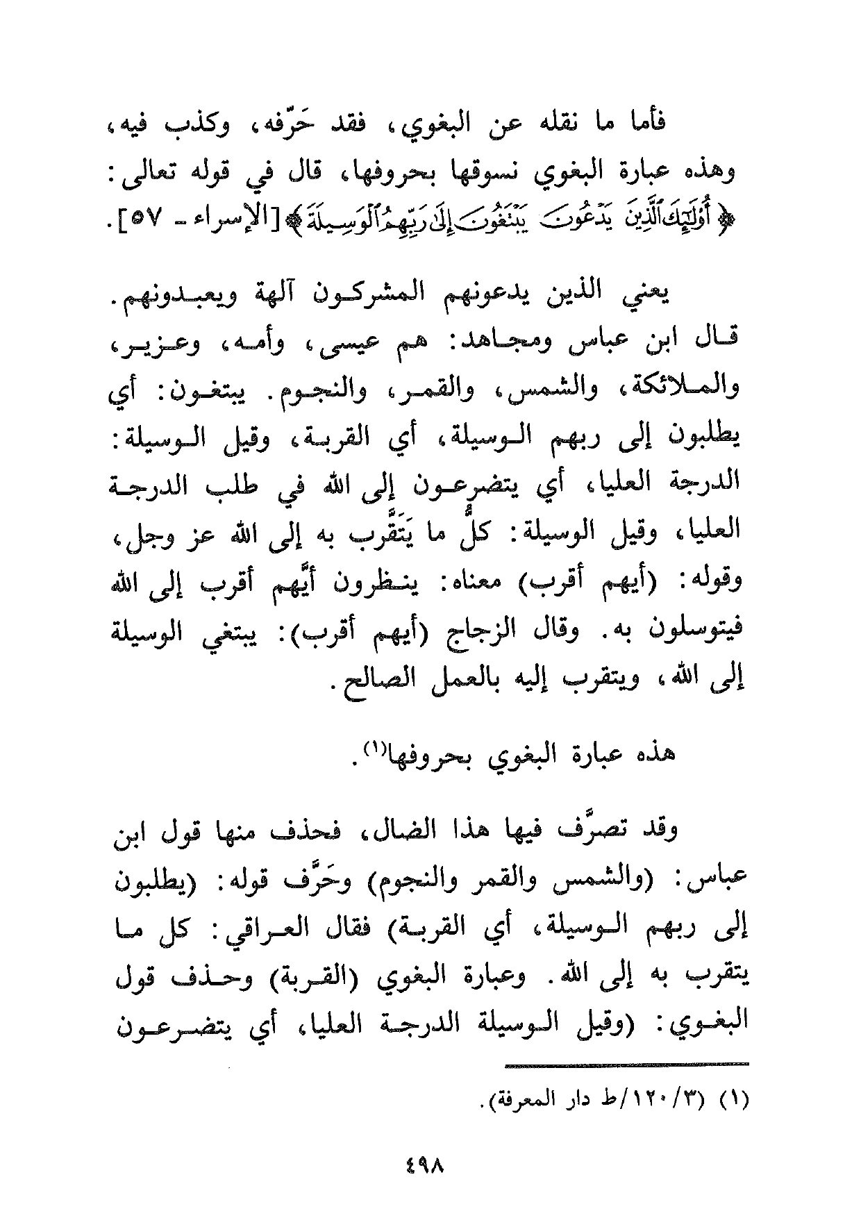 وقد تصرف فيها هذا الضال، فحذف منها قول ابن عباس: (والشمس والقمر والنجوم) ، وحرف قوله: (يطلبون إلى ربهم الوسيلة أي القربة) فقال العراقي: كل ما يتقرب به إلى الله، وعبارة البغوي (القربة) وحذف قول البغوي: (وقيل الوسيلة الدرجة العليا، أي يتضرعون