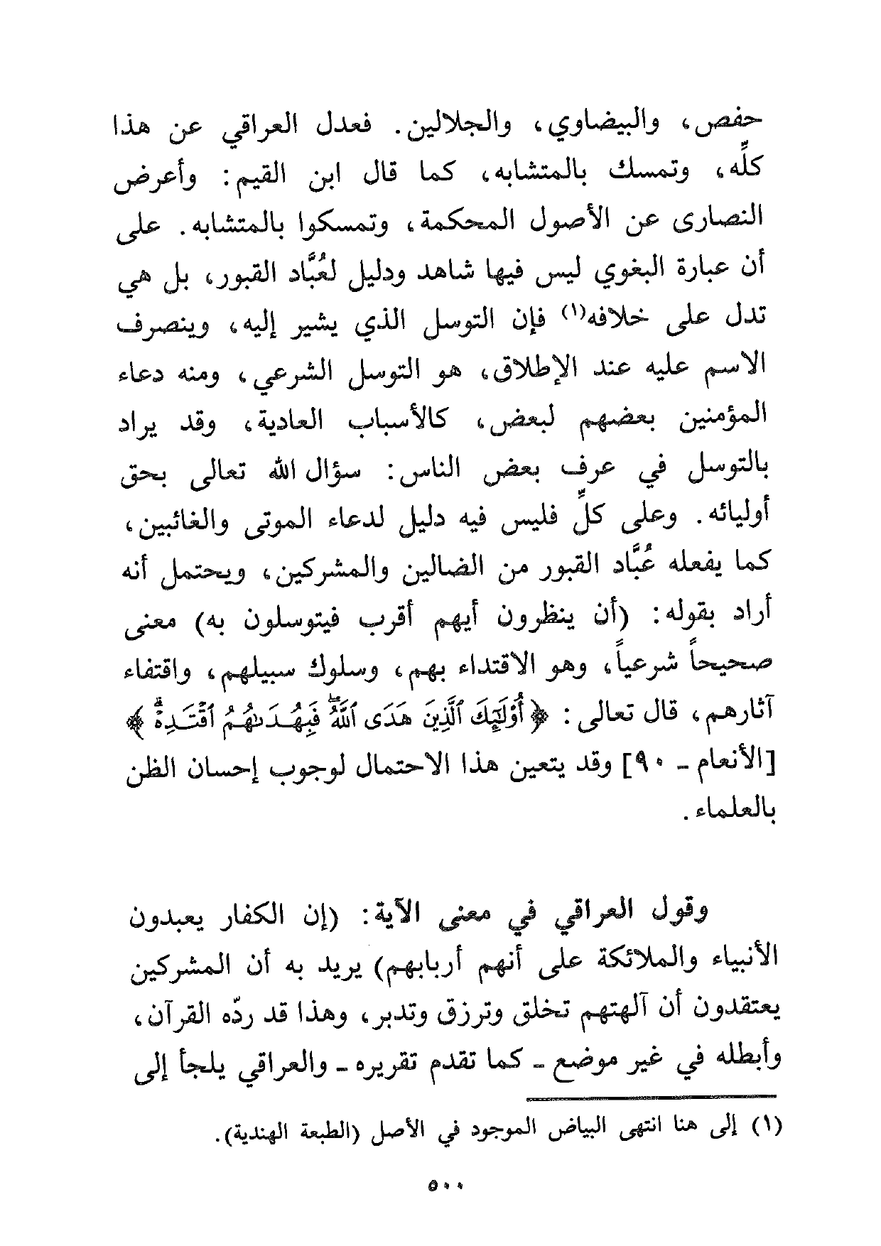 حفص والبيضاوي، والجلالين. فعدل العراقي عن هذا كله، وتمسك بالمتشابه، كما قال ابن القيم: وأعرض النصارى عن الأصول المحكمة، وتمسكوا بالمتشابه. على أن عبارة البغوي ليس فيها شاهد ودليل لعباد القبور، بل هي تدل على خلافه1 فإن التوسل الذي يشير إليه، وينصرف الاسم عليه عند الإطلاق، هو التوسل الشرعي، ومنه دعاء المؤمنين بعضهم لبعض، كالأسباب العادية، وقد يراد بالتوسل في عرف بعض الناس: سؤال الله تعالى بحق أوليائه. وعلى كل فليس فيه دليل لدعاء الموتى والغائبين، كما يفعله عباد القبور من الضالين والمشركين، ويحتمل أنه أراد بقوله: (أن ينظرون أيهم أقرب فيتوسلون به) معنى صحيحاً شرعياً، وهو الاقتداء بهم، وسلوك سبيلهم، واقتفاء آثارهم، قال تعالى: {أُولَئِكَ الَّذِينَ هَدَى اللَّهُ فَبِهُدَاهُمُ اقْتَدِه} [الأنعام: 90] وقد يتعين هذا الاحتمال لوجوب إحسان الظن بالعلماء.