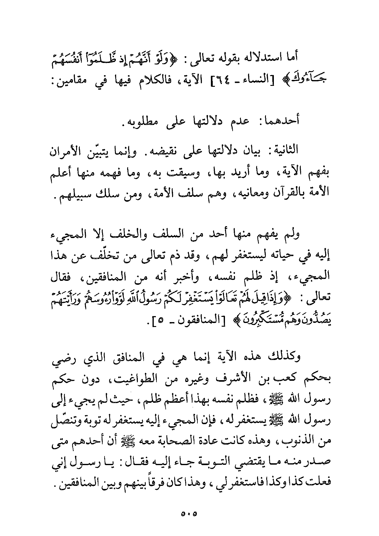 ولم يفهم منها أحد من السلف والخلف إلا المجيء إليه في حياته ليستغفر لهم، وقد ذم تعالى من تخلف عن هذا المجيء، إذ ظلم نفسه، وأخبر أنه من المنافقين، فقال تعالى: {وَإِذَا قِيلَ لَهُمْ تَعَالَوْا يَسْتَغْفِرْ لَكُمْ رَسُولُ اللَّهِ لَوَّوْا رُؤُوسَهُمْ وَرَأَيْتَهُمْ يَصُدُّونَ وَهُمْ مُسْتَكْبِرُونَ} [المنافقون:5] .