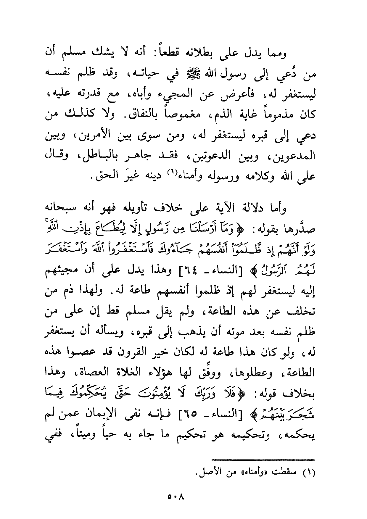 وأما دلالة الآية على خلاف تأويله فهو أنه سبحانه صدرها بقوله: {وَمَا أَرْسَلْنَا مِنْ رَسُولٍ إِلَّا لِيُطَاعَ بِإِذْنِ اللَّهِ وَلَوْ أَنَّهُمْ إِذْ ظَلَمُوا أَنْفُسَهُمْ جَاءُوكَ فَاسْتَغْفَرُوا اللَّهَ وَاسْتَغْفَرَ لَهُمُ الرَّسُولُ} [النساء:64] وهذا يدل على أن مجيئهم إليه ليستغفر لهم إذ ظلموا أنفسهم طاعة له، ولهذا ذم من تخلف عن هذه الطاعة، ولم يقل مسلم قط إن على من ظلم نفسه بعد موته أن يذهب إلى قبره، ويسأله أن يستغفر له، ولو كان هذا طاعة له لكان خير القرون قد عصوا هذه الطاعة، وعطلوها، ووفق لهذا هؤلاء الغلاة العصاة، وهذا بخلاف قوله: {فَلا وَرَبِّكَ لا يُؤْمِنُونَ حَتَّى يُحَكِّمُوكَ فِيمَا شَجَرَ بَيْنَهُمْ} [النساء:65] فإنه نفى الإيمان عمن لم يحكمه، وتحكيمه هو تحكيم ما جاء به حياً وميتاً، ففي