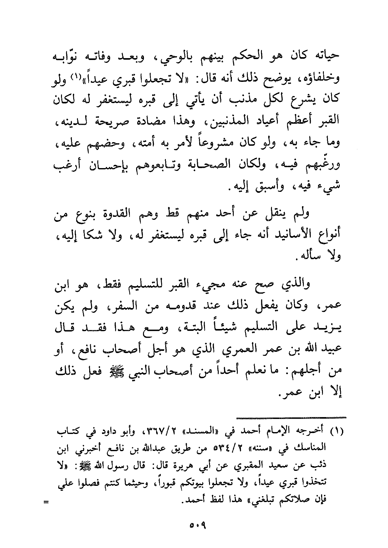 حياته كان هو الحكم بينهم بالوحي، وبعد وفاته نوابه وخلفاءه، يوضح ذلك أنه قال: "لا تجعلوا قبري عيداً "1 ولو كان يشرع لكل مذنب أن يأتي إلى قبره ليستغفر له لكان القبر أعظم أعياد المذنبين، وهذا مضادة صريحة لدينه، وما جاء به، ولو كان مشروعاً لأمر به أمته، وحضهم عليه، ورغبهم فيه، ولكان الصحابة وتابعوهم بإحسان أرغب شيء فيه، وأسبق إليه.