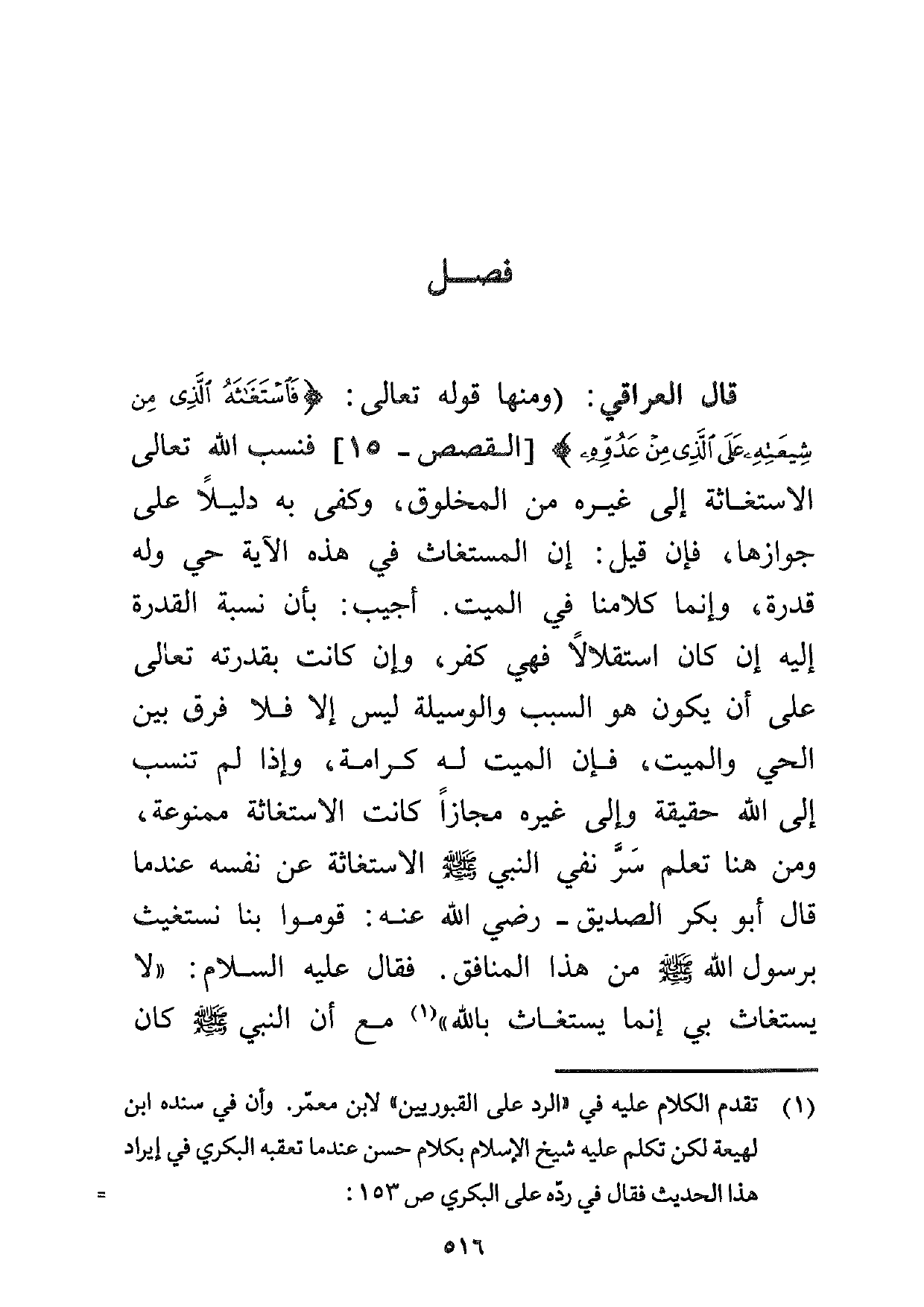 قال العراقي: (ومنها قوله تعالى: {فَاسْتَغَاثَهُ الَّذِي مِنْ شِيعَتِهِ عَلَى الَّذِي مِنْ عَدُوِّهِ} [القصص: 15] فنسب الله تعالى الاستغاثة إلى غيره من المخلوق، وكفى به دليلاً على جوازها، فإن قيل: إن المستغاث في هذه الآية حي وله قدرة، وإنما كلامنا في الميت. أجيب: بأن نسبة القدرة إليه إن كان استقلالاً فهي كفر، وإن كانت بقدرته تعالى على أن يكون هو السبب والوسيلة ليس إلا فلا فرق بين الحي والميت، فإن الميت له كرامة، وإذا لم تنسب إلى الله حقيقة وإلى غيره مجازاً كانت الاستغاثة ممنوعة، ومن هنا تعلم سر نفي النبي صلى الله عليه وسلم الاستغاثة عن نفسه عندما قال أبو بكر الصديق رضي الله عنه: قوموا بنا نستغيث برسول الله صلى الله عليه وسلم من هذا المنافق. فقال عليه السلام: " لا يستغاث بي إنما يستغاث بالله" 1 مع أن النبي صلى الله عليه وسلم كان