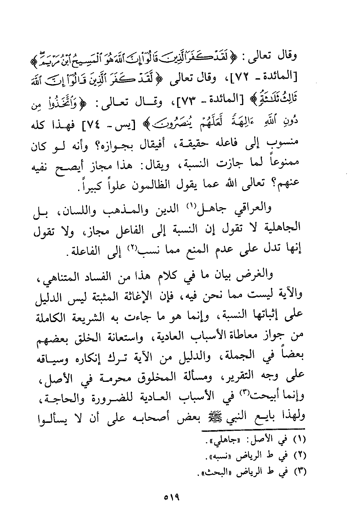 وقال تعالى: {لَقَدْ كَفَرَ الَّذِينَ قَالُوا إِنَّ اللَّهَ هُوَ الْمَسِيحُ ابْنُ مَرْيَمَ} [المائدة: 72] ، وقال تعالى: {لَقَدْ كَفَرَ الَّذِينَ قَالُوا إِنَّ اللَّهَ ثَالِثُ ثَلاثَةٍ} [المائدة: 73] ، وقال تعالى: {وَاتَّخَذُوا مِنْ دُونِ اللَّهِ آلِهَةً لَعَلَّهُمْ يُنْصَرُونَ} [يس:74] فهذا كله منسوب إلى فاعله حقيقة، أفيقال بجوازه؟ وأنه لو كان ممنوعاً لما جازت النسبة، ويقال: هذا مجاز أيصح نفيه عنهم؟ تعالى الله عما يقول الظالمون علواً كبيراً.