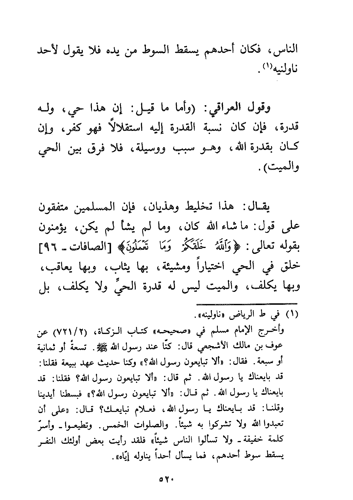 وأخرج الإمام مسلم في "صحيحه" كتاب الزكاة 2/721 عن عوف بن مالك الأشجعي قال: كنا عند رسول الله صلى الله عليه وسلم. تسعة أو ثمانية أو سبعة. فقال: "ألا تبايعون رسول الله؟ " وكنا حديث عهد ببيعة فقلنا: قد بايعناك يا رسول الله. ثم قال: "ألا تبايعون رسول الله؟ فقلنا: قد بايعناك يا رسول الله. ثم قال: "ألا تبايعون رسول الله؟ " فبسطنا أيدينا وقلنا: قد بايعناك يا رسول الله، فعلام نبايعك؟ قال: "على أن تعبدوا الله ولا تشركوا به شيئاً، والصلوات الخمس. وتطيعوا -وأسر كلمة خفيفة- ولا تسألوا الناس شيئاً" فلقد رأيت بعض أولئك النفر يسقط سوط أحدهم، فما يسأل أحداً يناوله إياه".