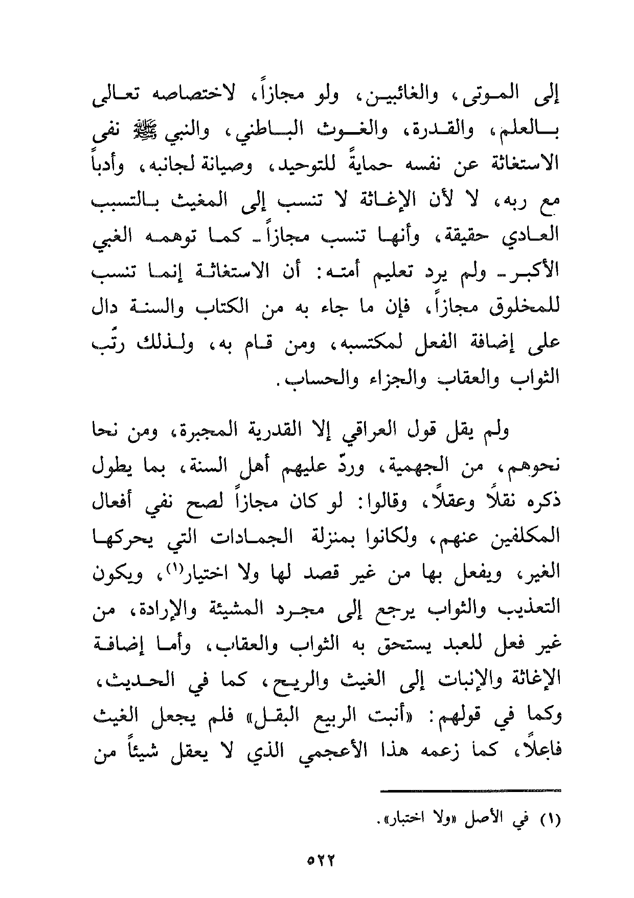 ولم يقول قول العراقي إلا القدرية المجبرة، ومن نحا نحوهم، من الجهمية ورد عليهم أهل السنة، بما يطول ذكره نقلاً وعقلاً، وقالوا: لو كان مجازاً لصح نفي أفعال المكلفين عنهم، ولكانوا بمنزلة الجمادات التي يحركها الغير، ويفعل بها من غير قصد لها ولا اختيار1، ويكون التعذيب والثواب يرجع إلى مجرد المشيئة والإرادة، من غير فعل للعبد يستحق به الثواب والعقاب، وأما إضافة الإغاثة والإنبات إلى الغيث والريح، كما في الحديث، وكما في قولهم: "أنبت الربيع البقل" فلم يجعل الغيث فاعلاً، كما زعمه هذا الأعجمي الذي لا يعقل شيئاً من