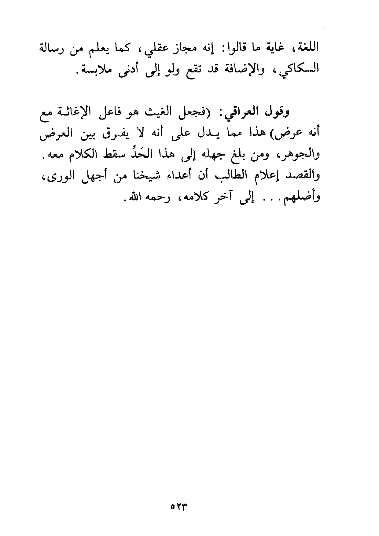 وقول العراقي: (فجعل الغيث هو فاعل الإغاثة مع أنه عرض) هذا مما يدل على أنه لا يفرق بين العرض والجوهر، ومن بلغ جهله إلى هذا الحد سقط الكلام معه. والقصد إعلام الطالب أن أعداء شيخنا من أجهل الورى، وأضلهم ... إلى آخر كلامه، رحمه الله.