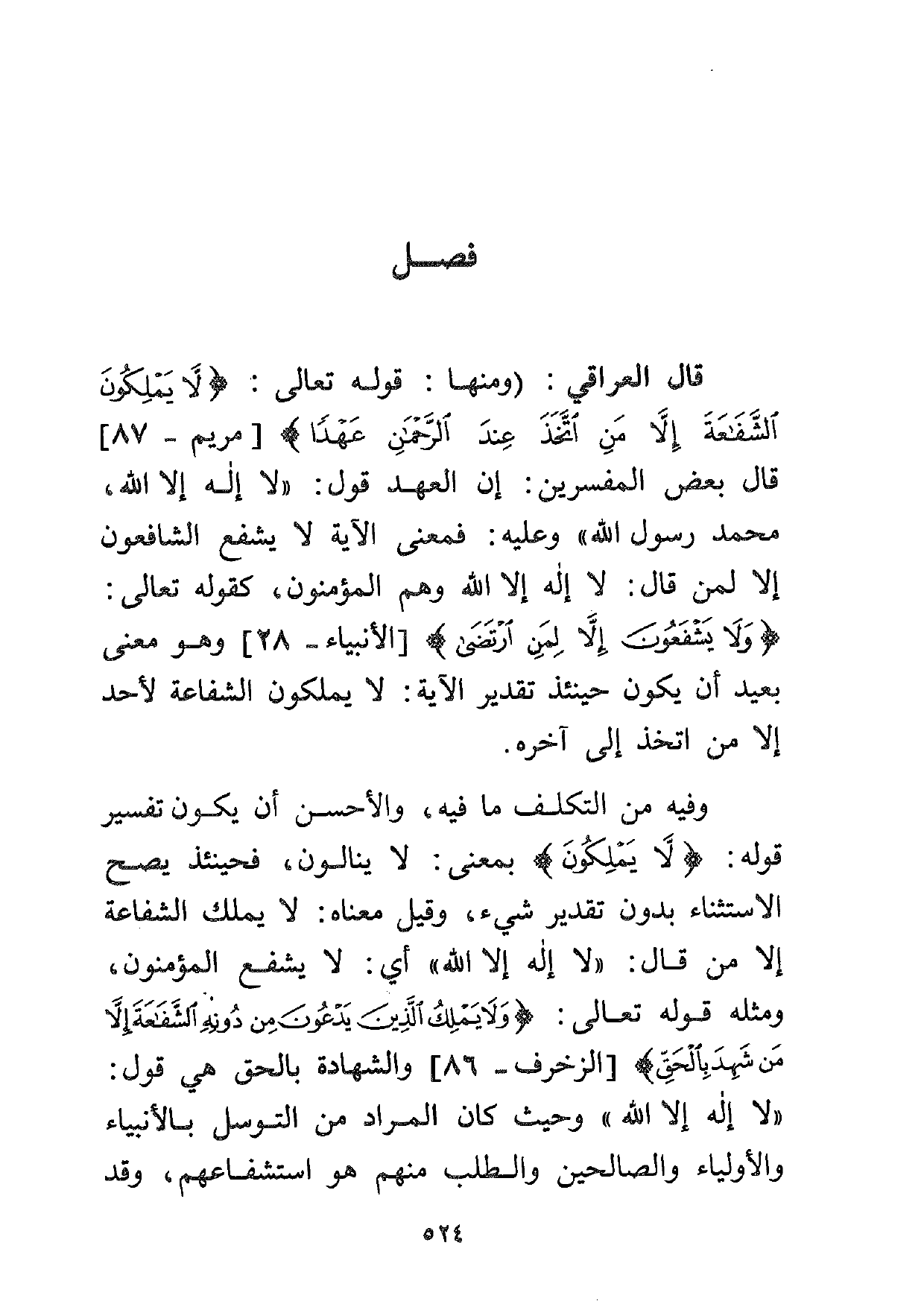 قال العراقي: (ومنها: قوله تعالى: {لا يَمْلِكُونَ الشَّفَاعَةَ إِلاَّ مَنِ اتَّخَذَ عِنْدَ الرَّحْمَنِ عَهْداً} [مريم:87] ، قال بعض المفسرين: إن العهد قول: "لا إله إلا الله، محمد رسول الله" وعليه: فمعنى الآية لا يشفع الشافعون إلا لمن قال: لا إله إلا الله وهم المؤمنون، كقوله تعالى: {وَلا يَشْفَعُونَ إِلاَّ لِمَنِ ارْتَضَى} [الأنبياء: 28] ، وهو معنى بعيد أن يكون حينئذ تقدير الآية: لا يملكون الشفاعة لأحد إلا من اتخذ إلى آخره.