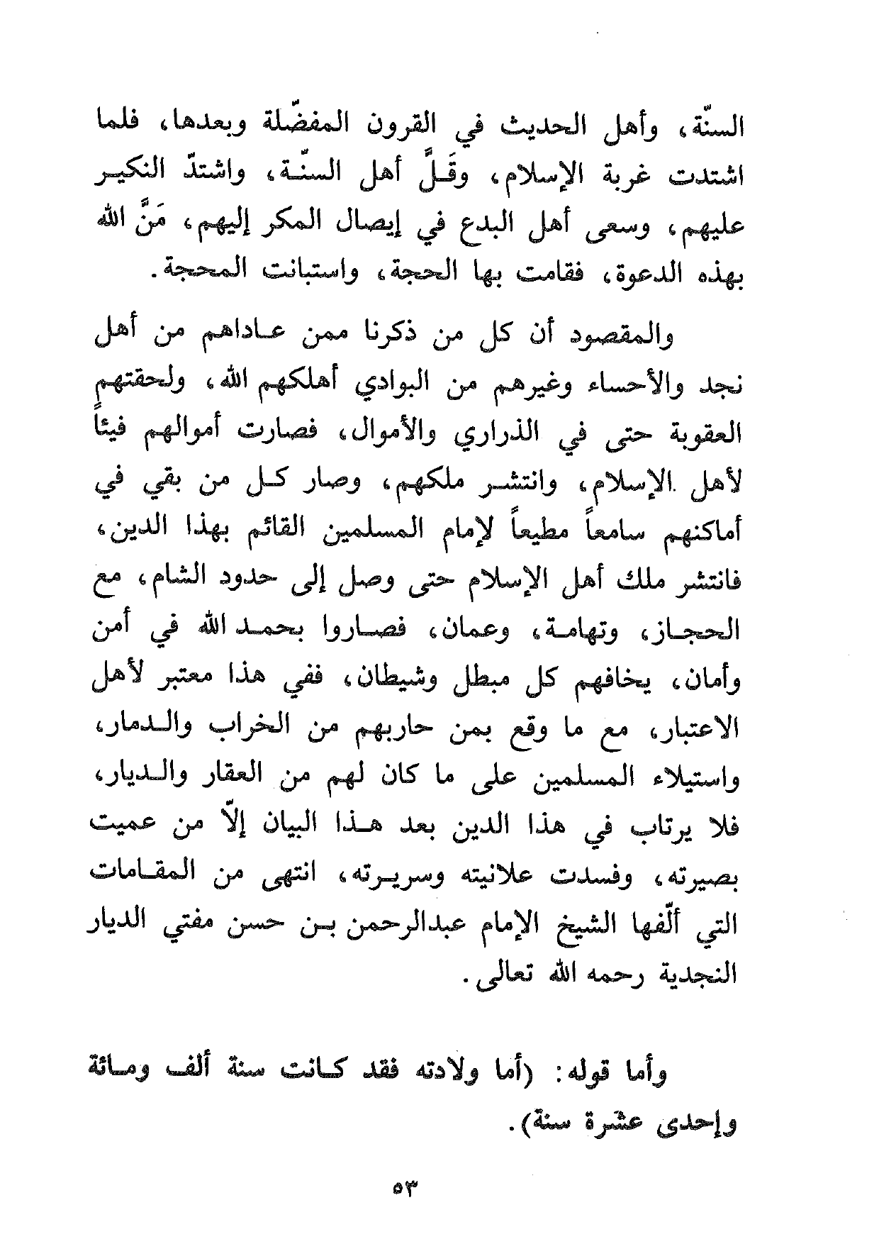 والمقصود أن كل من ذكرنا ممن عاداهم من أهل نجد والإحساء وغيرهم من البوادي أهلكهم الله، ولحقتهم العقوبة حتى في الذراري والأموال، فصارت أموالهم فيئاً لأهل الإسلام، وانتشر ملكهم، وصار كل من بقي في أماكنهم سامعاً مطيعاً لإمام المسلمين القائم بهذا الدين، فانتشر ملك أهل الإسلام حتى وصل إلى حدود الشام، مع الحجاز وتهامة وعمان، فصاروا بحمد الله في أمن وأمان، يخافهم كل مبطل وشيطان، ففي هذا معتبر لأهل الاعتبار، مع ما وقع بمن حاربهم من الخراب والدمار، واستيلاء المسلمين على ما كان لهم من العقار والديار، فلا يرتاب في هذا الدين بعد هذا البيان إلا من عميت بصيرته، وفسدت علانيته وسريرته، انتهى من المقامات التي ألفها الشيخ الإمام عبد الرحمن بن حسن مفتي الديار النجدية رحمه الله تعالى.