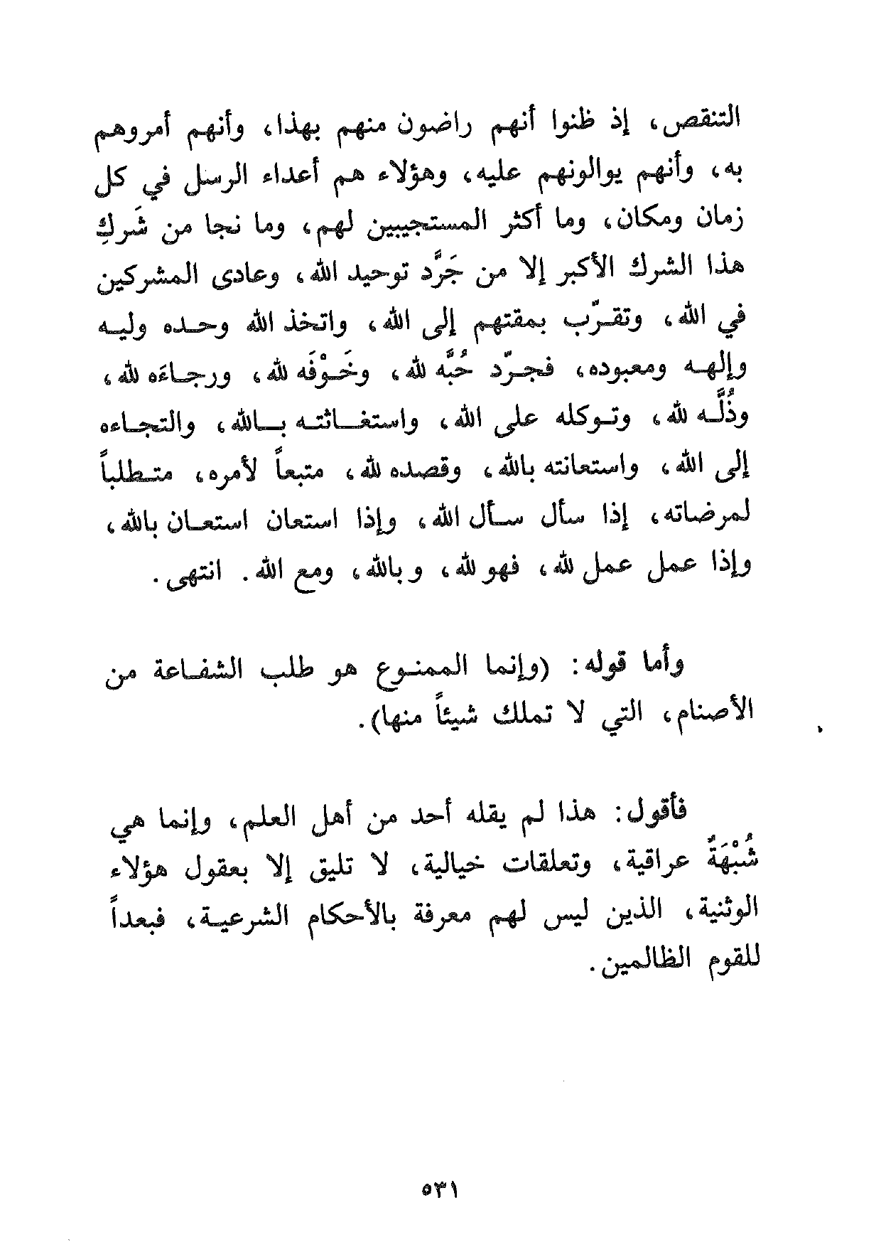 التنقص، إذ ظنوا أنهم راضون منهم بهذا، وأنهم أمروهم به، وأنهم يوالونهم عليه، وهؤلاء هم أعداء الرسل في كل زمان ومكان، وما أكثر المستجيبين لهم، وما نجا من شرك هذا الشرك الأكبر إلا من جرد توحيد الله، وعادى المشركين في الله، وتقرب بمقتهم إلى الله، واتخذ الله وحده وليه وإلهه ومعبوده، فجرد حبه لله، وخوفه لله، ورجاءه لله، وذله لله، وتوكله على الله، واستغاثته بالله، والتجاءه إلى الله، واستعانته بالله، وقصده لله، متبعاً لأمره، متطلباً لمرضاته، إذا سأل سأل الله، وإذا استعان استعان بالله، وإذا عمل عمل لله، فهو لله، وبالله، ومع الله، انتهى.