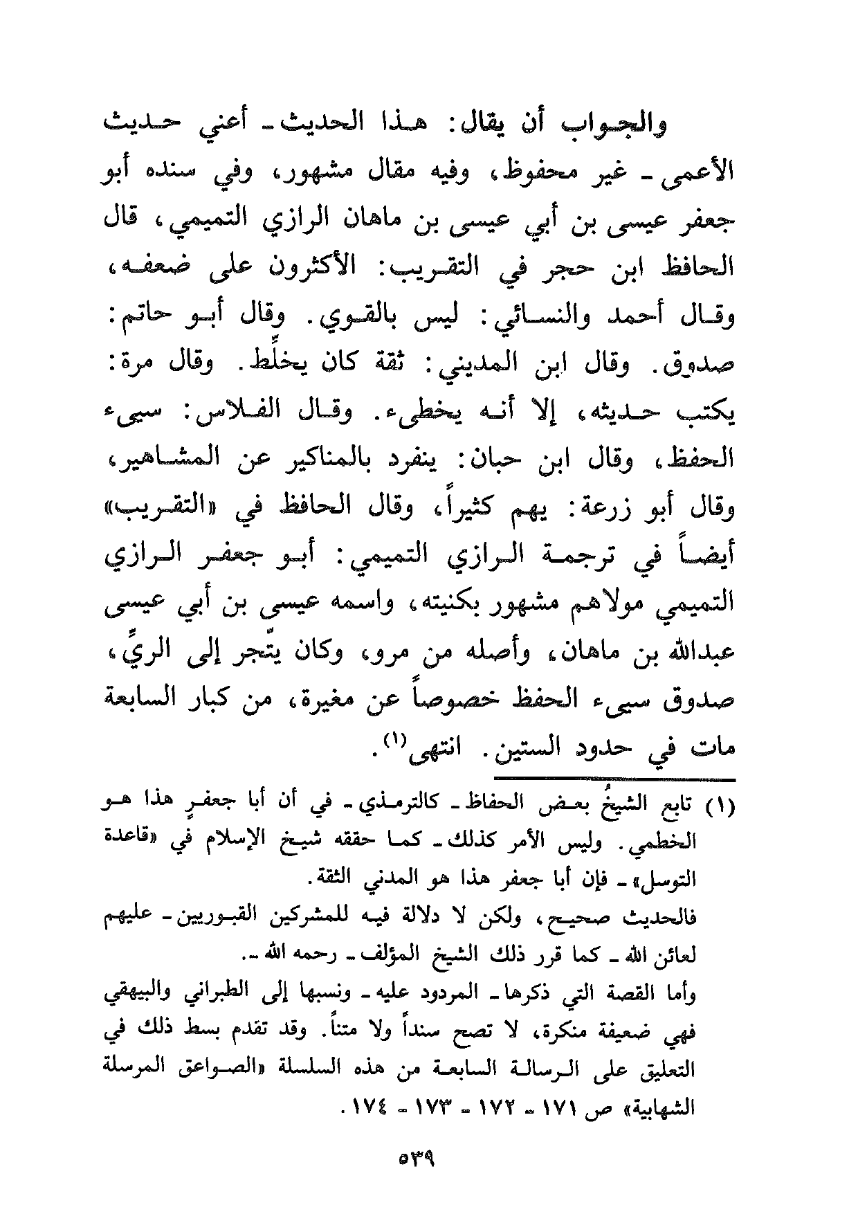 1 تابع الشيخ بعض الحفاظ -كالترمذي- في أن أبا جعفر هذا هو الخطمي. وليس الأمر كذلك -كما حققه شيخ الإسلام في "قاعدة التوسل" فإن أبا جعفر هذا هو المدني الثقة.