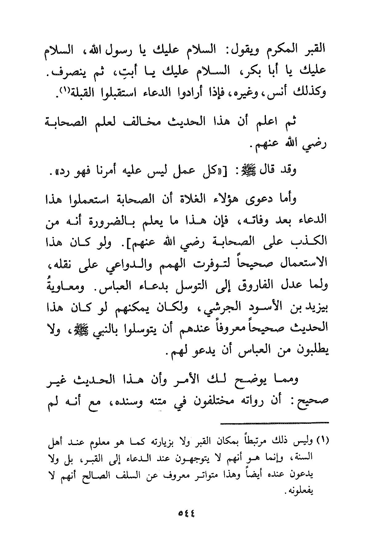 1 وليس ذلك مرتبطاً بمكان القبر ولا بزيارته كما هو معلوم عند أهل السنة، وإنما هو أنهم لا يتوجهون عند الدعاء إلى القبر، بل ولا يدعون عنده أيضاً، وهذا متواتر معروف عن السلف الصالح أنهم لا يفعلونه.