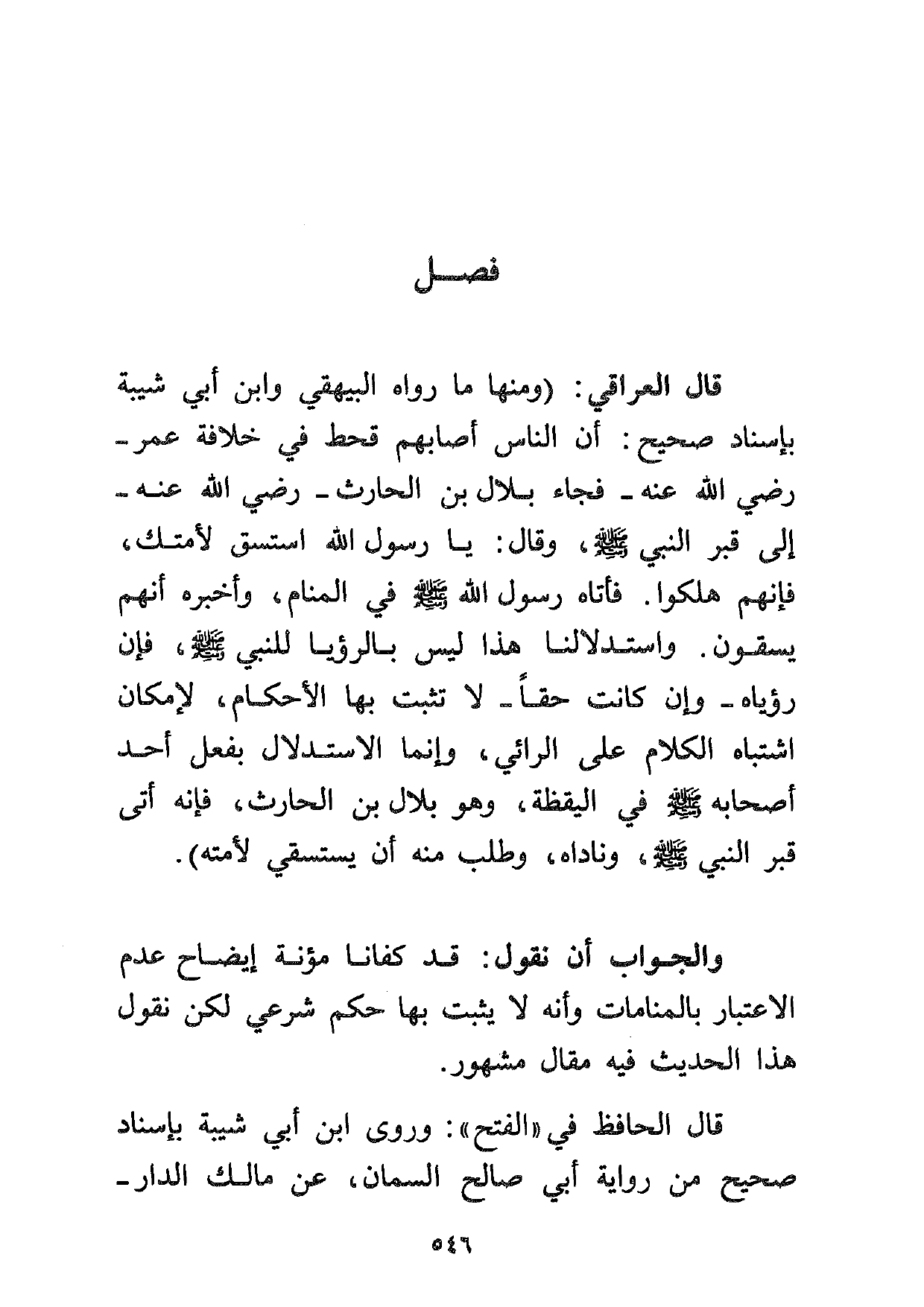 قال العراقي: (ومنها ما رواه البيهقي وابن أبي شيبة بإسناد صحيح: أن الناس أصابهم قحط في خلافة عمر رضي الله عنه فجاء بلال بن الحارث رضي الله عنه إلى قبر النبي صلى الله عليه وسلم، وقال: يا رسول الله استسق لأمتك، فإنهم هلكوا. فأتاه رسول الله صلى الله عليه وسلم في المنام، وأخبره أنهم يسقون. واستدلالنا هذا ليس بالرؤيا للنبي صلى الله عليه وسلم، فإن رؤياه -وإن كانت حقاً- لا تثبت بها الأحكام، لإمكان اشتباه الكلام على الرائي، وإنما استدلال بفعل أحد أصحابه صلى الله عليه وسلم في اليقظة، وهو بلال بن الحارث، فإنه أتى قبر النبي صلى الله عليه وسلم وناداه، وطلب منه أن يستسقي لأمته) .