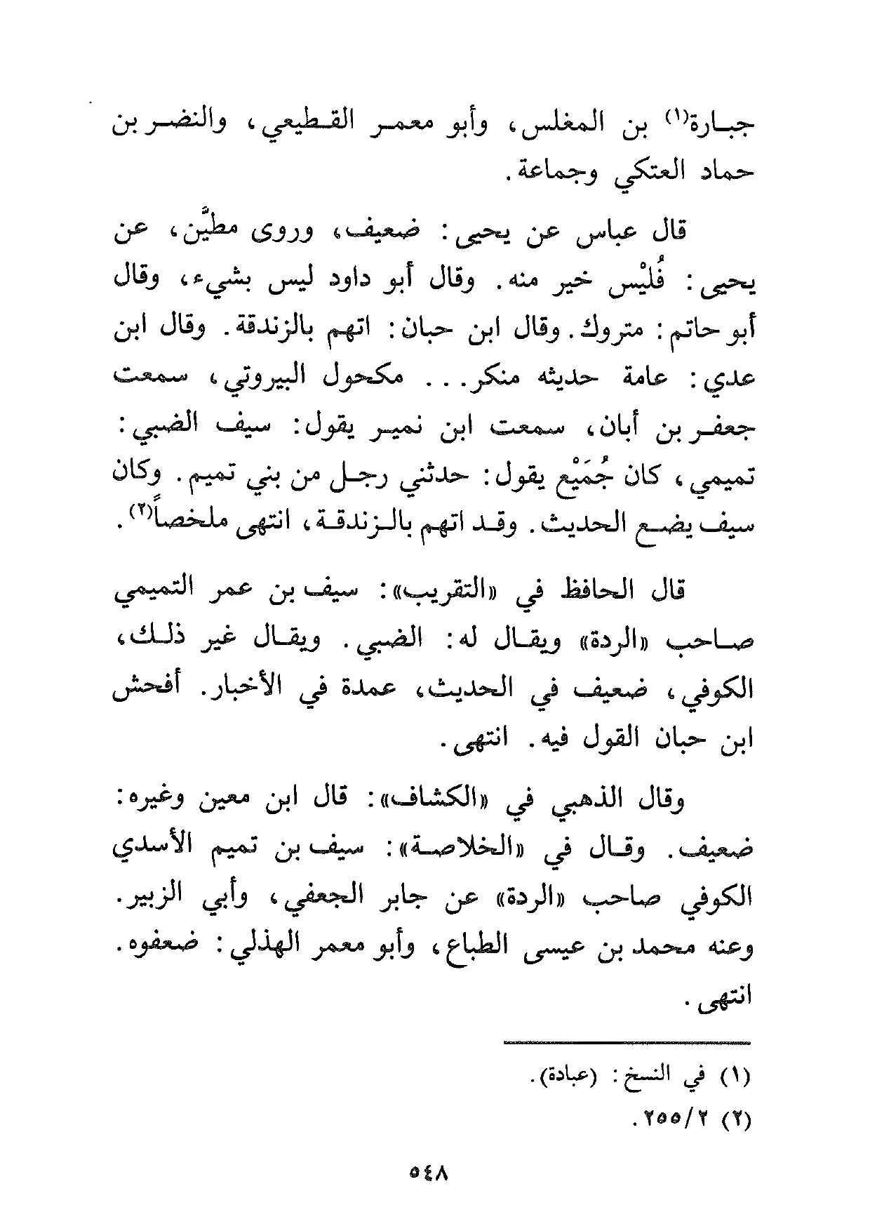 قال عباس عن يحيى: ضعيف، وروى مطين، عن يحيى: فليس خير منه. وقال أبو داود ليس بشيء، وقال أبو حاتم: متروك. وقال ابن حبان: اتهم بالزندقة. وقال ابن عدي: عامة حديثه منكر ... مكحول البيروتي، سمعت جعفر بن أبان، سمعت ابن نمير يقول: سيف الضبي: تميمي، كان جميع يقول: حدثني رجل من بني تميم. وكان سيف يضع الحديث. وقد اتهم بالزندقة، انتهى ملخصاً2.