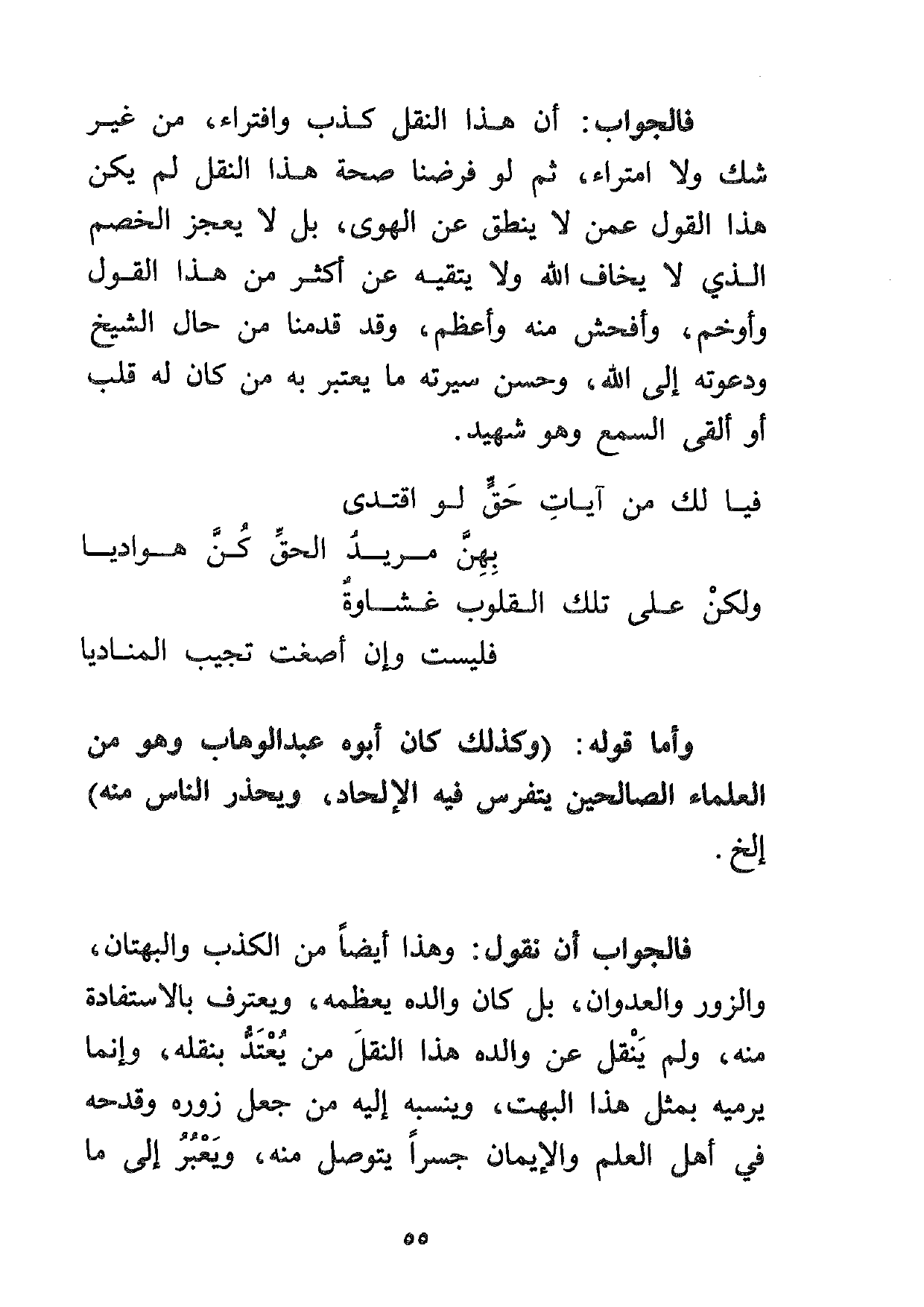 فالجواب: أن هذا النقل كذب وافتراء، من غير شك ولا امتراء، ثم لو فرضنا صحة هذا النقل لم يكن هذا القول عمن لا ينطق عن الهوى، بل لا يعجز الخصم الذي لا يخاف الله ولا يتقيه عن أكثر من هذا القول وأوخم، وأفحش منه وأعظم، وقد قدمنا من حال الشيخ ودعوته إلى الله، وحسن سيرته ما يعتبر به من كان له قلب أو ألقى السمع وهو شهيد.