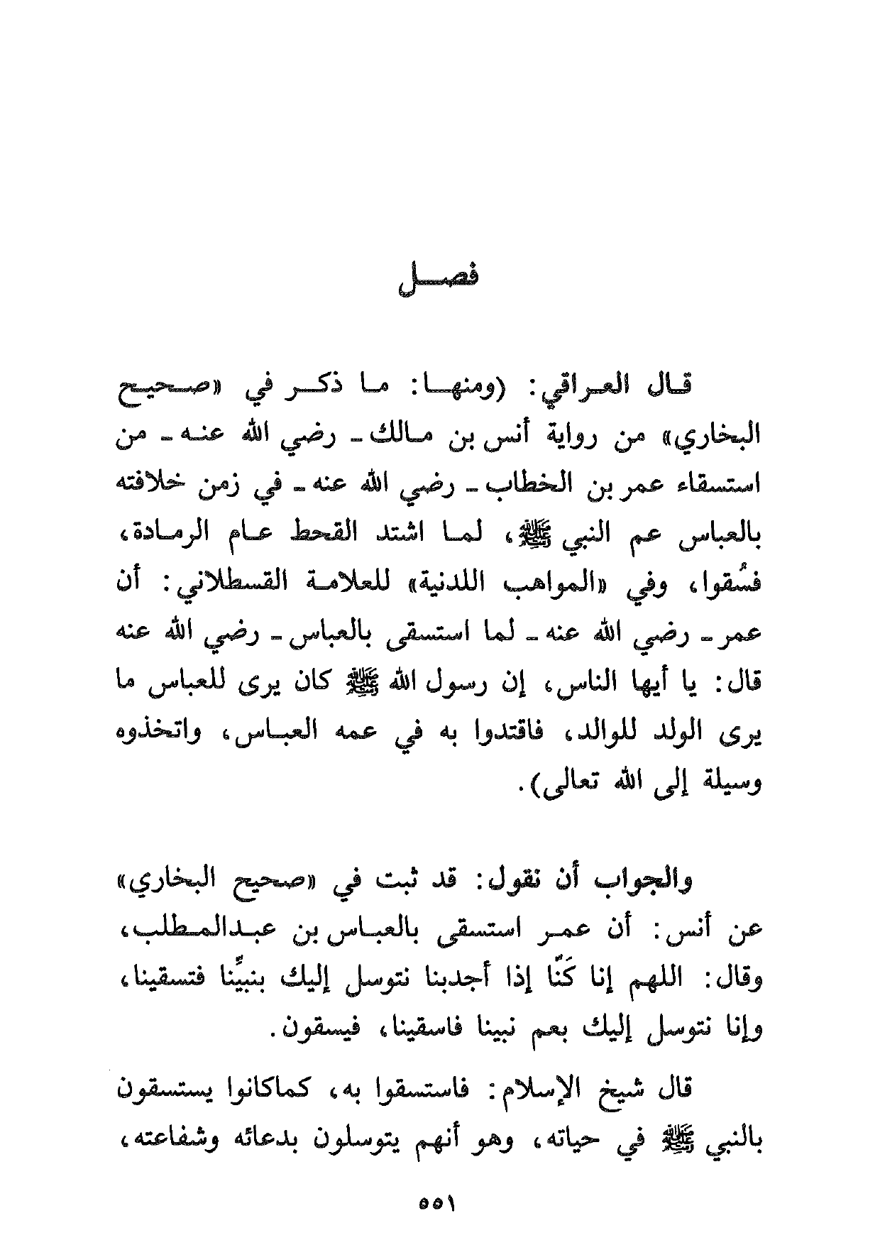 قال العراقي: (ومنها: ما ذكر في "صحيح البخاري" من رواية أنس بن مالك رضي الله عنه من استسقاء عمر بن الخطاب رضي الله عنه في زمن خلافته بالعباس عم النبي صلى الله عليه وسلم، لما اشتد القحط عام الرمادة، فسقوا، وفي "المواهب اللدنية" للعلامة القسطلاني: أن عمر رضي الله عنه لما استسقى بالعباس رضي الله عنه قال: يا أيها الناس، إن رسول الله صلى الله عليه وسلم كان يرى للعباس ما يرى الولد للوالد، فاقتدوا به في عمه العباس، واتخذوه وسيلة إلى الله تعالى) .