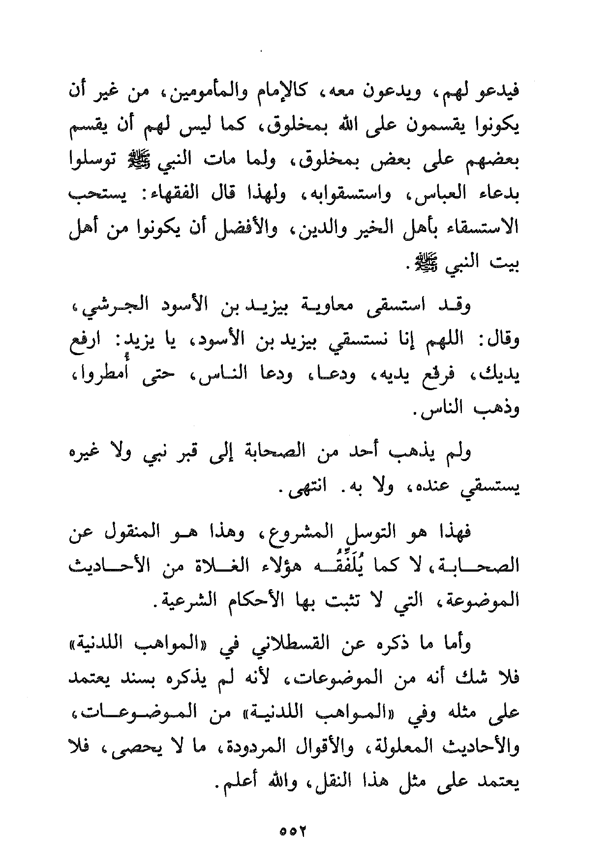 فيدعو لهم، ويدعون معه، كالإمام والمأمومين، من غير أن يكونوا يقسمون على الله بمخلوق، كما ليس لهم أن يقسم بعضهم على بعض بمخلوق، ولما مات النبي صلى الله عليه وسلم توسلوا بدعاء العباس، واستسقوا به، ولهذا قال الفقهاء: يستحب الاستسقاء بأهل الخير والدين، والأفضل أن يكونوا من أهل بيت النبي صلى الله عليه وسلم.