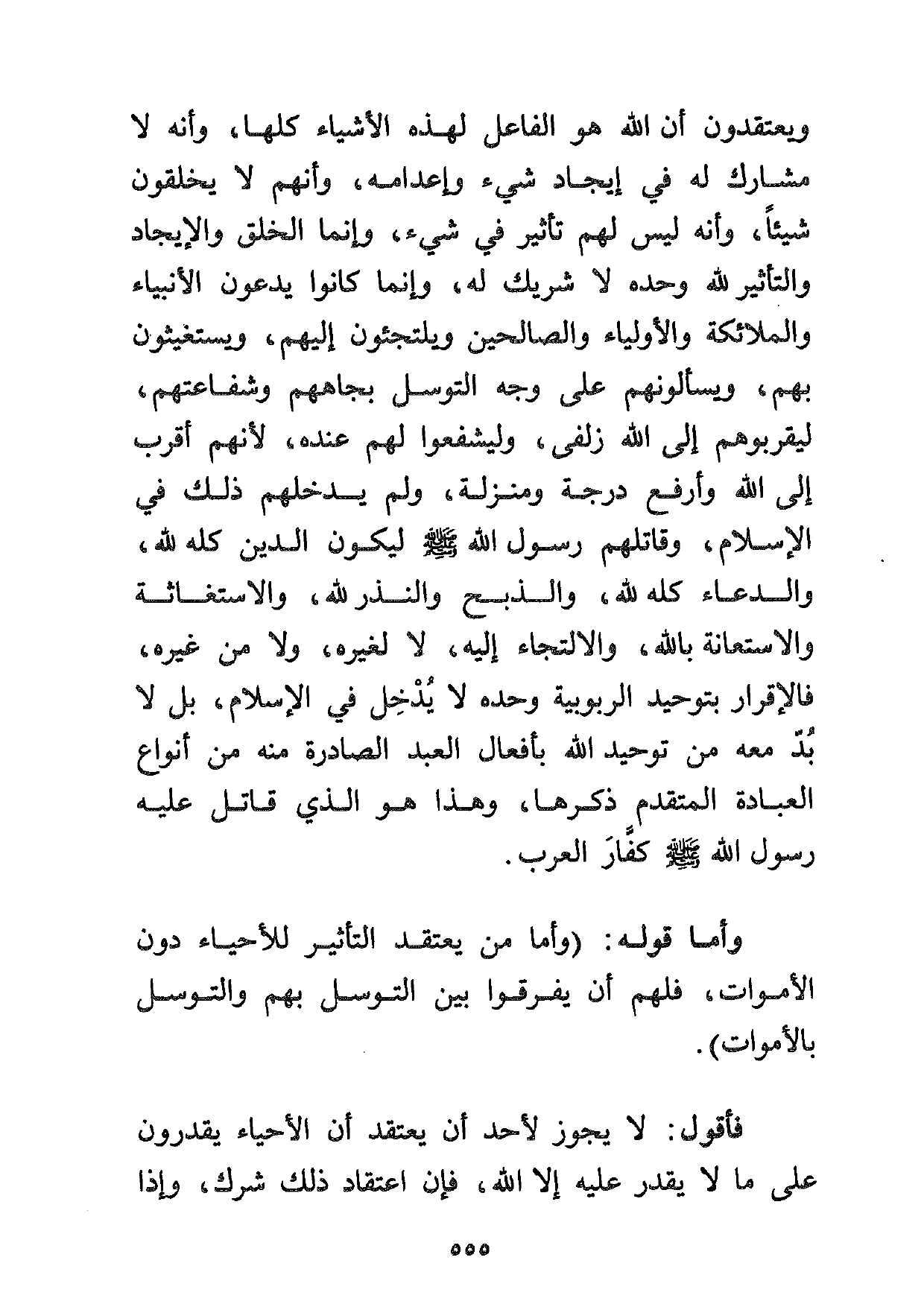ويعتقدون أن الله هو الفاعل لهذه الأشياء كلها، وأنه لا مشارك له في إيجاد شيء وإعدامه، وأنهم لا يخلقون شيئاً، وأنه ليس لهم تأثير في شيء، وإنما الخلق والإيجاد والتأثير لله وحده لا شريك له، وإنما كانوا يدعون الأنبياء والملائكة والأولياء والصالحين ويلتجئون إليهم، ويستغيثون بهم، ويسألونهم على وجه التوسل بجاههم وشفاعتهم، ليقربوهم إلى الله زلفى، وليشفعوا لهم عنده، لأنهم أقرب إلى الله وأرفع درجة ومنزلة، ولم يدخلهم ذلك في الإسلام، وقاتلهم رسول الله صلى الله عليه وسلم ليكون الدين كله لله، والدعاء كله لله، والذبح والنذر لله، والاستغاثة والاستعانة بالله، والالتجاء إليه، لا لغيره، ولا من غيره، فالإقرار بتوحيد الربوبية وحده لا يدخل في الإسلام، بل لا بد معه من توحيد الله بأفعال العبد الصادرة منه من أنواع العبادة المتقدم ذكرها، وهذا هو الذي قاتل عليه رسول الله صلى الله عليه وسلم كفار العرب.