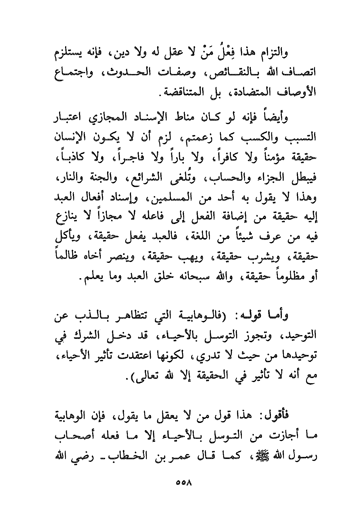 وأيضاً فإنه لو كان مناط الإسناد المجازي اعتبار التسبب والكسب كما زعمتم، لزم أن لا يكون الإنسان حقيقة مؤمناً ولا كافراً، ولا باراً ولا فاجراً، ولا كاذباً، فيبطل الجزاء والحساب، وتلغى الشرائع، والجنة والنار، وهذا لا يقول به أحد من المسلمين، وإسناد أفعال العبد إليه حقيقة مع إضافة الفعل إلى فاعله لا مجازاً لا ينازع فيه من عرف شيئاً من اللغة، فالعبد يفعل حقيقة، ويأكل حقيقة، ويشرب حقيقة، ويهب حقيقة، وينصر أخاه ظالماً أو مظلوماً حقيقة، والله سبحانه خلق العبد وما يعلم.