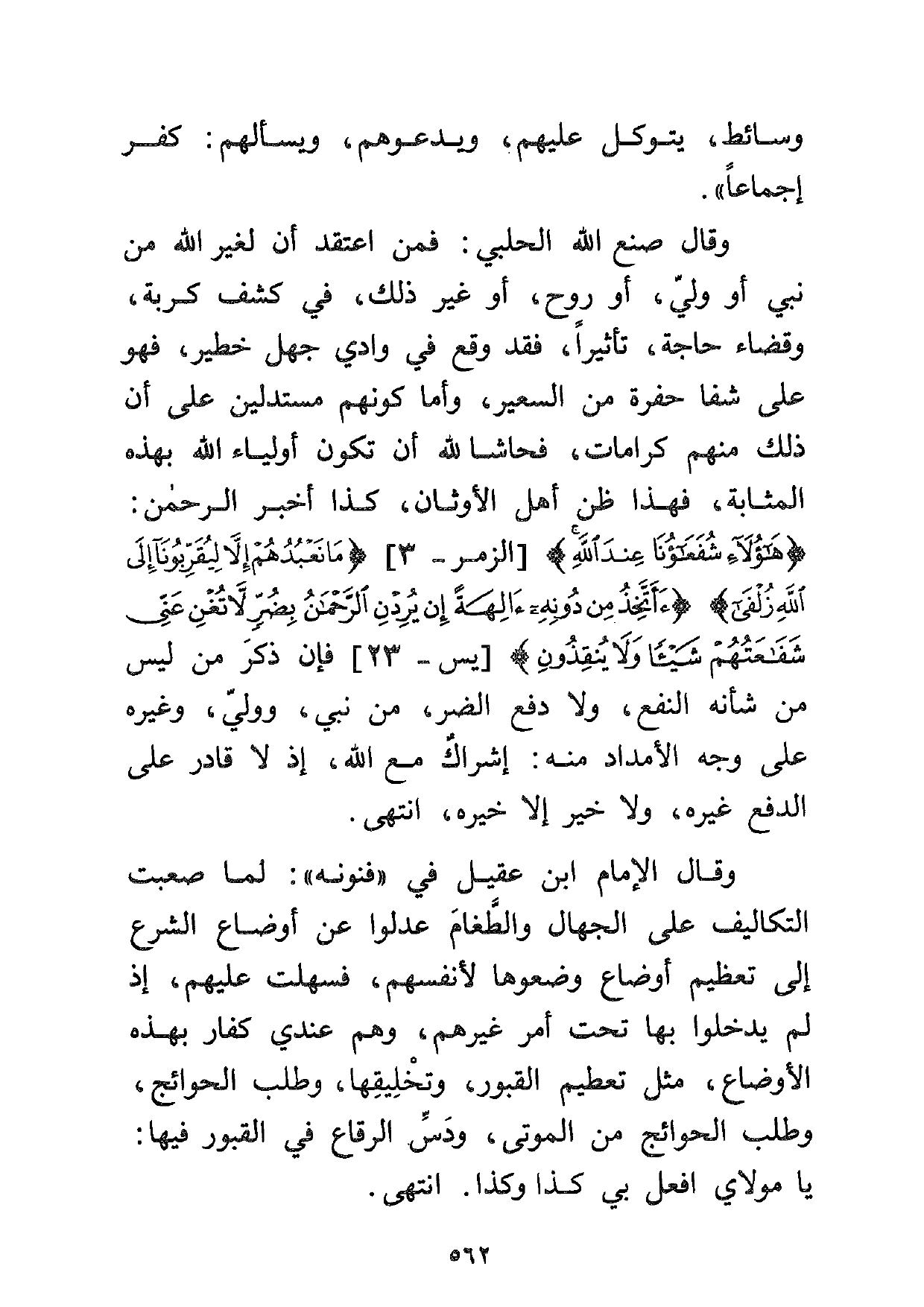 وقال صنع الله الحلبي: فمن اعتقد أن لغير الله من نبي أو ولي أو روح، أو غير ذلك في كشف كربة، وقضاء حاجة تأثيراً، فقد وقع في وادي جهل خطير، فهو على شفا حفرة من السعير، وأما كونهم مستدلين على أن ذلك منهم كرامات، فحاشا لله أن تكون أولياء الله بهذه المثابة، فهذا ظن أهل الأوثان، كذا أخبر الرحمن: {هَؤُلاءِ شُفَعَاؤُنَا عِنْدَ اللَّهِ} ، {مَا نَعْبُدُهُمْ إِلَّا لِيُقَرِّبُونَا إِلَى اللَّهِ زُلْفَى} [الزمر: 3] ، {أَأَتَّخِذُ مِنْ دُونِهِ آلِهَةً إِنْ يُرِدْنِ الرَّحْمَنُ بِضُرٍّ لا تُغْنِ عَنِّي شَفَاعَتُهُمْ شَيْئاً وَلا يُنْقِذُونِ} [يس:23] ، فإن ذكر من ليس من شأنه النفع، ولا دفع الضر، مع نبي وولي، وغيره على وجه الأمداد منه: إشراك مع الله، إذ لا قادر على الدفع غيره، ولا خير إلا خيره. انتهى.