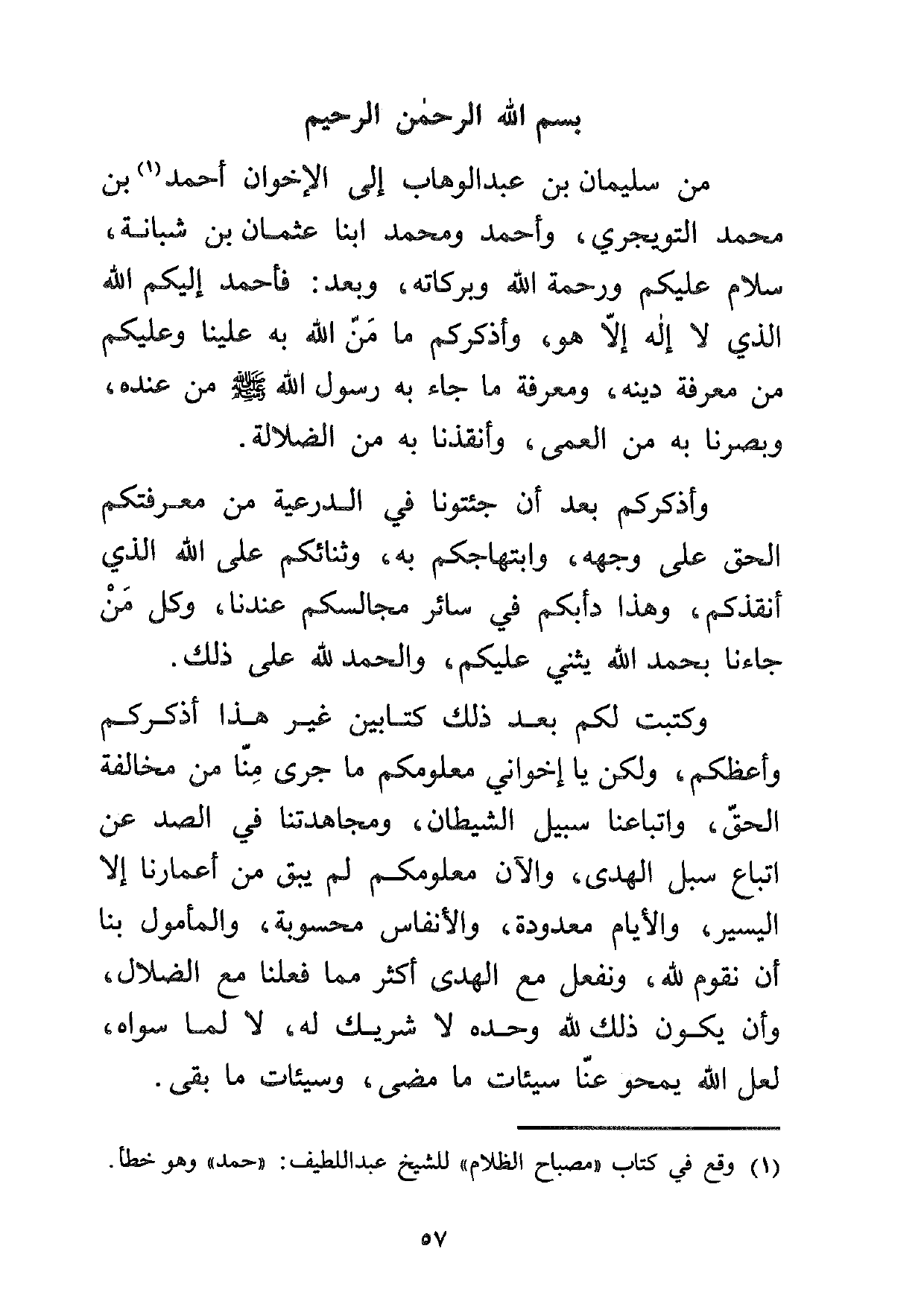 من سليمان بن عبد الوهاب إلى الإخوان أحمد1 بن محمد التويجري، وأحمد ومحمد ابنا عثمان بن شبانة، سلام عليكم ورحمة الله وبركاته، وبعد: فأحمد إليكم الله الذي لا إله إلا هو، وأذكركم ما من الله به علينا وعليكم من معرفة دينه ومعرفة ما جاء به رسول الله صلى الله عليه وسلم من عنده، وبصرنا به من العمى وأنقذنا به من الضلالة.