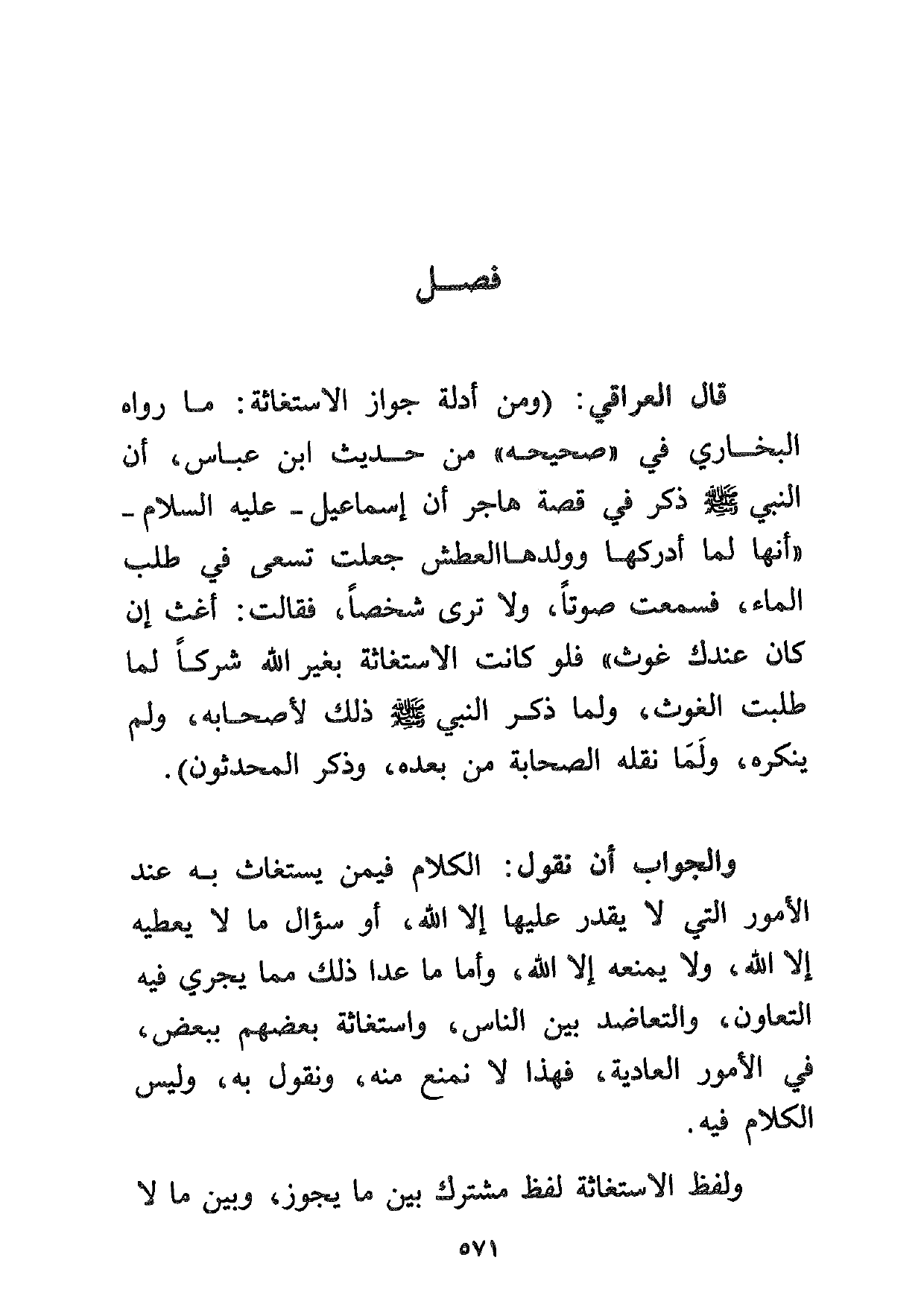 قال العراقي: (ومن أدلة جواز الاستغاثة: ما رواه البخاري في "صحيحه" من حديث ابن عباس، أن النبي صلى الله عليه وسلم ذكر في قصة هاجر أن إسماعيل عليه السلام "أنها لما أدركها وولدها العطش جعلت تسعى في طلب الماء، فسمعت صوتاً ولا ترى شخصاً، فقالت: أغث إن كان عندك غوث" فلو كانت الاستغاثة بغير الله شركاً لما طلبت الغوث، ولما ذكر النبي صلى الله عليه وسلم ذلك لأصحابه، ولم ينكره، ولما نقله الصحابة من بعده، وذكر المحدثون) .