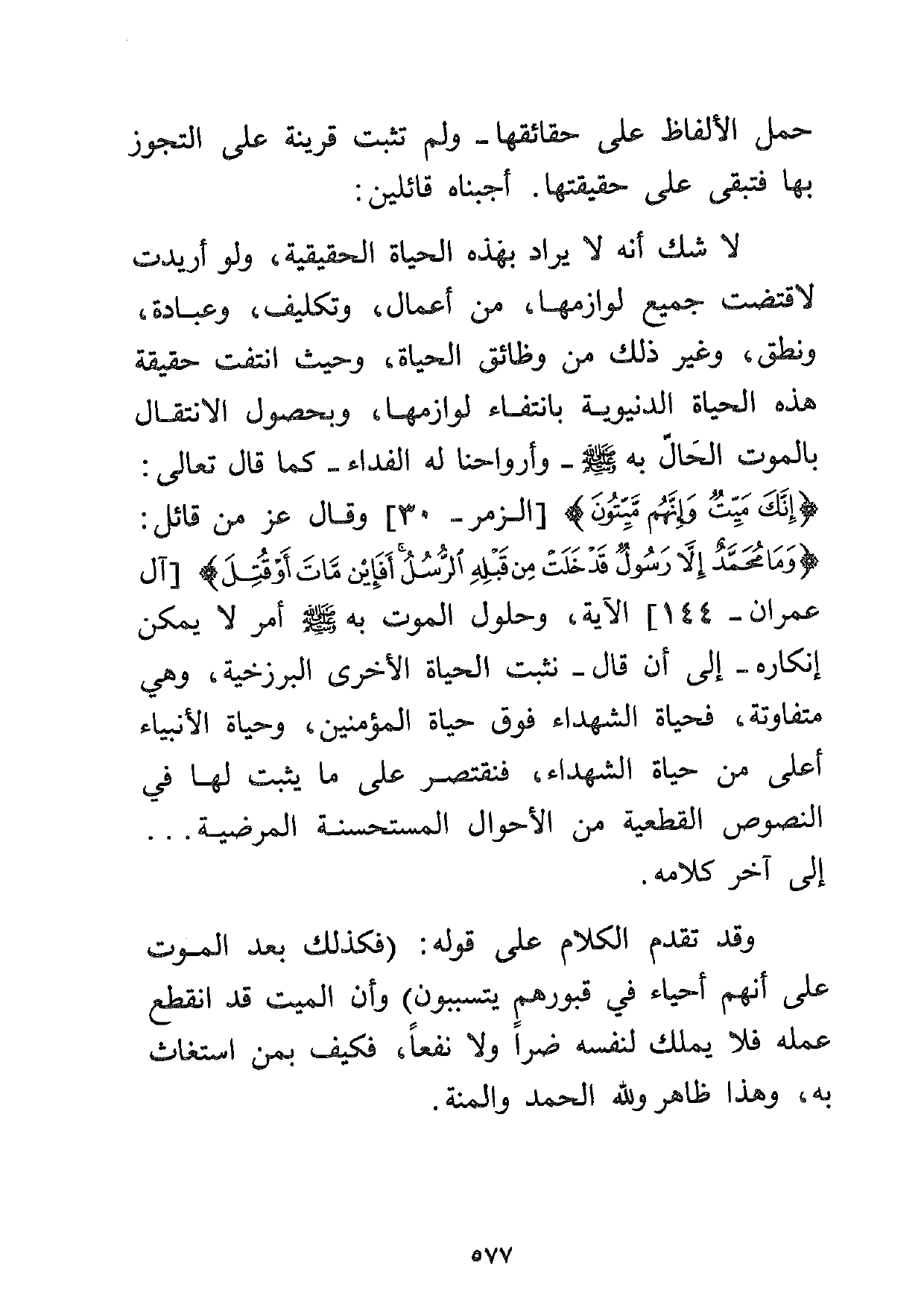 لا شك أنه لا يراد بهذه الحياة الحقيقية، ولو أريدت لاقتضت جميع لوازمها، من أعمال وتكليف وعبادة، ونطق وغير ذلك من وظائف الحياة، وحيث انتفت حقيقة هذه الحياة الدنيوية بانتفاء لوازمها، وبحصول الانتقال بالموت الحال به صلى الله عليه وسلم -وأرواحنا له الفداء- كما قال تعالى: {إِنَّكَ مَيِّتٌ وَإِنَّهُمْ مَيِّتُونَ} [الزمر:30] ، وقال عز من قائل: {وَمَا مُحَمَّدٌ إِلَّا رَسُولٌ قَدْ خَلَتْ مِنْ قَبْلِهِ الرُّسُلُ أَفَإِنْ مَاتَ أَوْ قُتِل} [آل عمران: 144] الآية، وحلول الموت به صلى الله عليه وسلم أمر لا يمكن إنكاره -إلى أن قال- نثبت الحياة الأخرى البرزخية، وهي متفاوتة، فحياة الشهداء فوق حياة المؤمنين، وحياة الأنبياء أعلى من حياة الشهداء، فنقتصر على ما يثبت لها في النصوص القطعية من الأحوال المستحسنة المرضية ... إلى آخر كلامه.