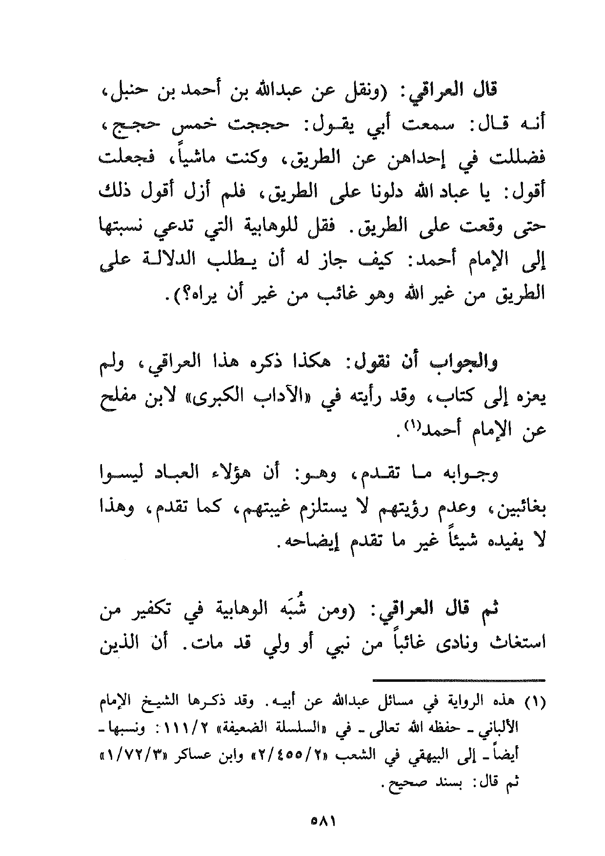قال العراقي: (ونقل عن عبد الله بن أحمد بن حنبل، أنه قال: سمعت أبي يقول: حججت خمس حجج، فضللت في إحداهن عن الطريق، وكنت ماشياً، فجعلت أقول: يا عباد لله دلونا على الطريق، فلم أزل أقول ذلك حتى وقعت على الطريق. فقل للوهابية التي تدعي نسبتها إلى الإمام أحمد: كيف جاز له أن يطلب الدلالة على الطريق من غير الله وهو غائب من غير أن يراه؟) .