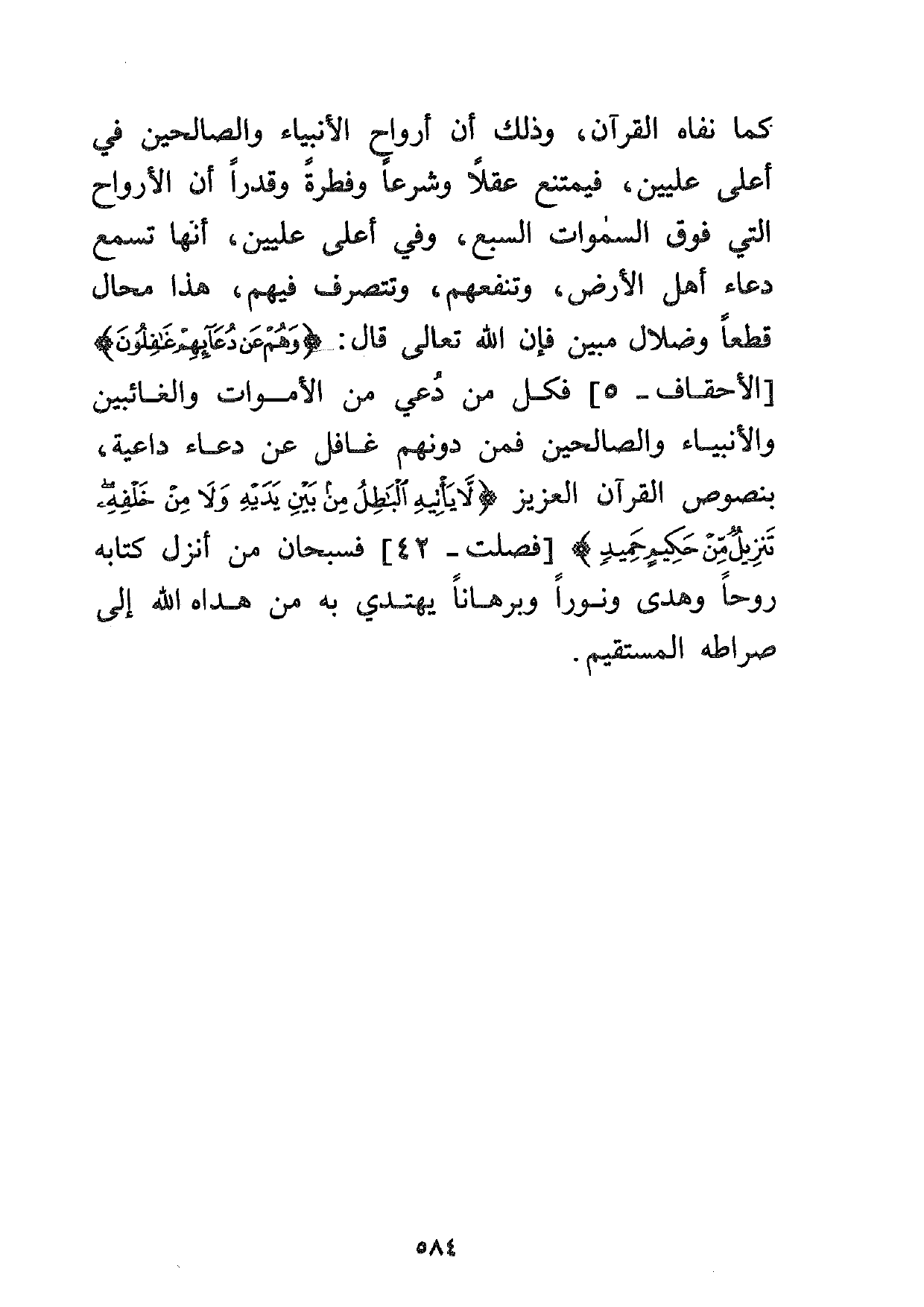 كما نفاه القرآن، وذلك أن أرواح الأنبياء والصالحين في أعلى عليين، فيمتنع عقلاً وشرعاً وفطرة وقدراً أن الأرواح التي فوق السموات السبع، وفي أعلى عليين، أنها تسمع دعاء أهل الأرض، وتنفعهم، وتتصرف فيهم، هذا محال قطعاً وضلال مبين، فإن الله تعالى قال: {وَهُمْ عَنْ دُعَائِهِمْ غَافِلُونَ} [الأحقاف: 5] ، فكل من دعي من الأموات والغائبين والأنبياء والصالحين فمن دونهم غافل عن دعاء داعية، بنصوص القرآن العزيز {لا يَأْتِيهِ الْبَاطِلُ مِنْ بَيْنِ يَدَيْهِ وَلا مِنْ خَلْفِهِ تَنْزِيلٌ مِنْ حَكِيمٍ حَمِيدٍ} [فصلت:42] فسبحان من أنزل كتابه روحاً وهدى ونوراً وبرهاناً يهتدي به من هداه الله إلى صراطه المستقيم.