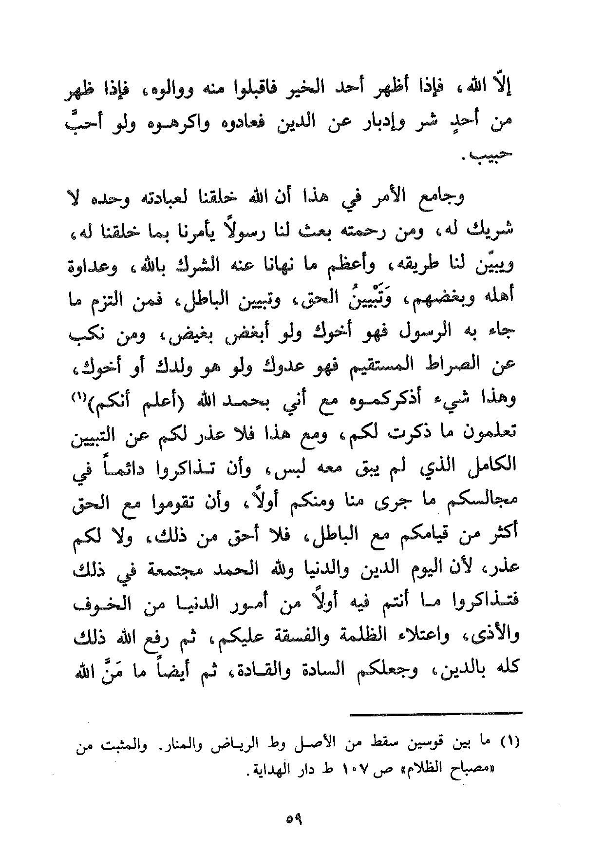 وجامع الأمر في هذا أن الله خلقنا لعبادته وحده لا شريك له، ومن رحمته بعث لنا رسولاً يأمرنا بما خلقنا له، ويبين لنا طريقه، وأعظم ما نهانا عنه الشرك بالله، وعداوة أهله وبغضهم، وتبيين الحق، وتبيين الباطل، فمن التزم ما جاء به الرسول فهو أخوك ولو أبغض بغيض، ومن نكب عن الصراط المستقيم فهو عدوك ولو هو ولدك أو أخوك، وهذا شيء أذكركموه مع أني بحمد الله (أعلم أنكم) 1 تعلمون ما ذكرت لكم، ومع هذا فلا عذر لكم عن التبيين الكامل الذي لم يبق معه لبس، وأن تذاكروا دائماً في مجالسكم ما جرى منا ومنكم أولاً، وأن تقوموا مع الحق أكثر من قيامكم مع الباطل، فلا أحق من ذلك، ولا لكم عذر، لأن اليوم الدين والدنيا، ولله الحمد مجتمعة في ذلك فتذاكروا ما أنتم فيه أولاً من أمور الدنيا من الخوف والأذى، واعتلاء الظلمة والفسقة عليكم، ثم رفع الله ذلك كله بالدين، وجعلكم السادة والقادة، ثم أيضا ما منّ الله