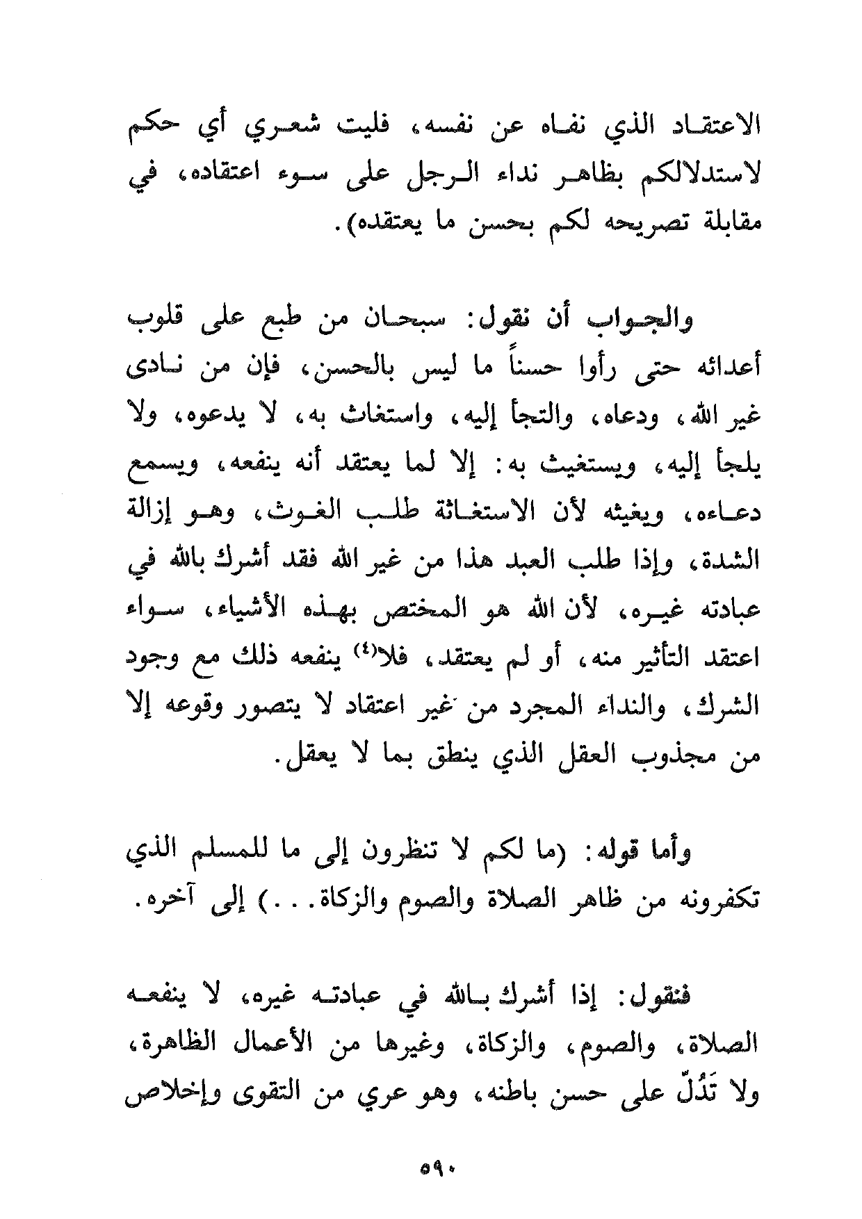 والجواب أن نقول: سبحان من طبع على قلوب أعدائه، حتى رأوا حسناً ما ليس بالحسن، فإن من نادى غير الله، ودعاه والتجأ إليه، واستغاث به، لا يدعوه، ولا يلجأ إليه، ويستغيث به: إلا لما يعتقد أنه ينفعه، ويسمع دعاءه، ويغيثه لأن الاستغاثة طلب الغوث، وهو إزالة الشدة، وإذا طلب العبد هذا من غير الله فقد أشرك بالله في عبادته غيره، لأن الله هو المختص بهذه الأشياء، سواء اعتقد التأثير منه، أو لم يعتقد، فلا ينفعه ذلك مع وجود الشرك، والنداء المجرد من غير اعتقاد لا يتصور وقوعه إلا من مجذوب العقل الذي ينطق بما لا يعقل.