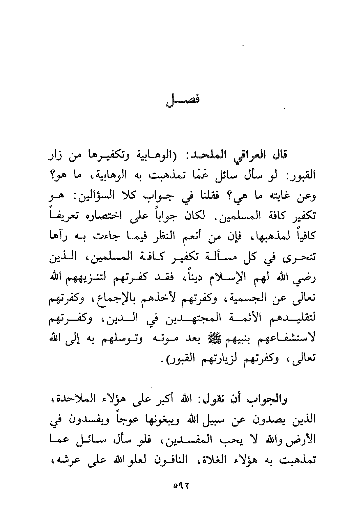 قال العراقي الملحد: (الوهابية وتكفيرها من زار القبور: لو سأل سائل عما تمذهبت به الوهابية، ما هو؟ وعن غايته ما هي؟ فقلنا في جواب كلا السؤالين: هو تكفير كافة المسلمين. لكان جواباً على اختصاره تعريفاً كافياً لمذهبها، فإن من أنعم النظر فيما جاءت به رآها تتحرى في كل مسألة تكفير كافة المسلمين، الذي رضي الله لهم الإسلام ديناً، فقد كفرتهم لتنزيههم الله تعالى عن الجسمية، وكفرتهم لأخذهم بالإجماع، وكفرتهم لتقليدهم الأئمة المجتهدين في الدين، وكفرتهم لاستشفاعهم بنبيهم صلى الله عليه وسلم بعد موته، وتوسلهم به إلى الله تعالى، وكفرتهم لزيارتهم القبور) .
