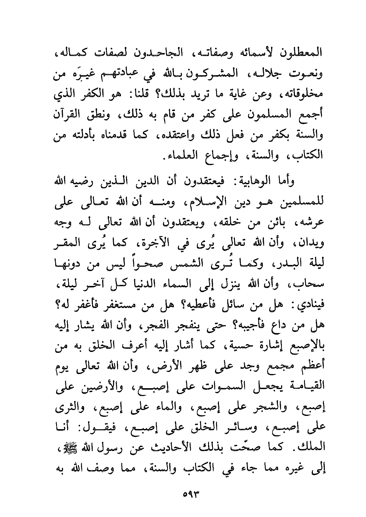 وأما الوهابية: فيعتقدون أن الدين الذين رضيه الله للمسلمين هو دين الإسلام، ومنه أن الله تعالى على عرشه بائن من خلقه، ويعتقدون أن الله تعالى له وجه ويدان، وأن الله تعالى يرى في الآخرة، كما يرى القمر ليلة البدر، وكما ترى الشمس صحواً ليس من دونها سحاب، وأن الله ينزل إلى السماء الدنيا كل آخر ليلة، فينادي: هل من سائل فأعطيه؟ هل من مستغفر فأغفر له؟ هل من داع فأجيبه؟ حتى ينفجر الفجر، وأن الله يشار إليه بالإصبع إشارة حسية، كما أشار إليه أعرف الخلق به من أعظم مجمع وجد على ظهر الأرض، وأن الله تعالى يوم القيامة يجعل السموات على إصبع، والأرضين على إصبع، والشجر على إصبع، والماء على إصبع، والثرى على إصبع، وسائر الخلق على إصبع، فيقول: أنا الملك. كما صحت بذلك الأحاديث عن رسول الله صلى الله عليه وسلم، إلى غيره مما جاء في الكتاب والسنة، مما وصف الله به