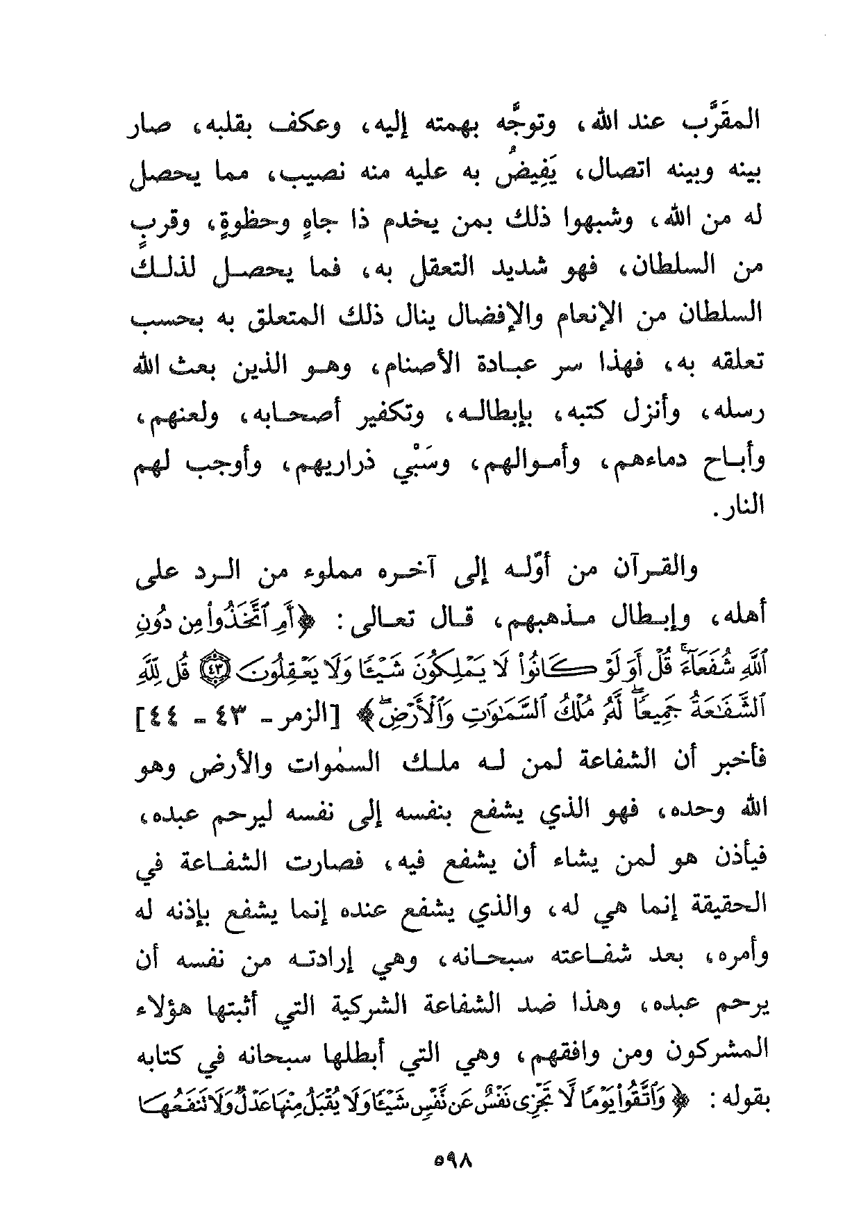 والقرآن من أوله إلى آخره مملوء من الرد على أهله، وإبطال مذهبهم، قال تعالى: {أَمِ اتَّخَذُوا مِنْ دُونِ اللَّهِ شُفَعَاءَ قُلْ أَوَلَوْ كَانُوا لا يَمْلِكُونَ شَيْئاً وَلا يَعْقِلُونَ. قُلْ لِلَّهِ الشَّفَاعَةُ جَمِيعاً لَهُ مُلْكُ السَّمَاوَاتِ وَالْأَرْضِ} [الزمر:43-44] , فأخبر أن الشفاعة لمن له ملك السموات والأرض وهو الله وحده، فهو الذي يشفع بنفسه إلى نفسه ليرحم عبده، فيأذن هو لمن يشاء أن يشفع فيه، فصارت الشفاعة في الحقيقة إنما هي له، والذي يشفع عنده إنما يشفع بإذنه له وأمره، بعد شفاعته سبحانه، وهي إرادته من نفسه أن يرحم عبده، وهذا ضد الشفاعة الشركية التي أثبتها هؤلاء المشركون ومن وافقهم، وهي التي أبطلها سبحانه في كتابه بقول: {وَاتَّقُوا يَوْماً لا تَجْزِي نَفْسٌ عَنْ نَفْسٍ شَيْئاً وَلا يُقْبَلُ مِنْهَا عَدْلٌ وَلا تَنْفَعُهَا