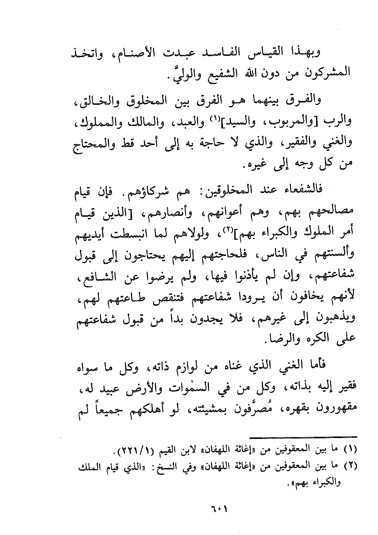 فالشفعاء عند المخلوقين: هم شركاؤهم. فإن قيام مصالحهم بهم، وهم أعوانهم وأنصارهم، [الذين قيام أمر الملوك والكبراء بهم] 2 ولولاهم لما انبسطت أيديهم وألسنتهم في الناس، فلحاجتهم إليهم يحتاجون إلى قبول شفاعتهم، وإن لم يأذنوا فيها، ولم يرضوا عن الشافع، لأنهم يخافون أن يردوا شفاعتهم فتنقض طاعتهم لهم، ويذهبون إلى غيرهم، فلا يجدون بداً من قبول شفاعتهم على الكره والرضا.