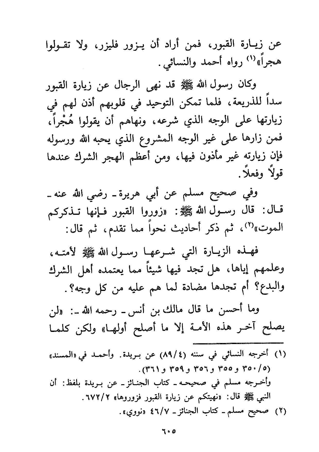 وكان رسول الله صلى الله عليه وسلم قد نهى الرجال عن زيارة القبور سداً للذريعة، فلما تمكن التوحيد في قلوبهم أذن لهم في زيارتها على الوجه الذي شرعه، ونهاهم أن يقولوا هجراً، فمن زارها على غير الوجه المشروع الذي يحبه الله ورسوله، فإن زيارته غير مأذون فيها، ومن أعظم الهجر الشرك عندها قولاً وفعلاً.