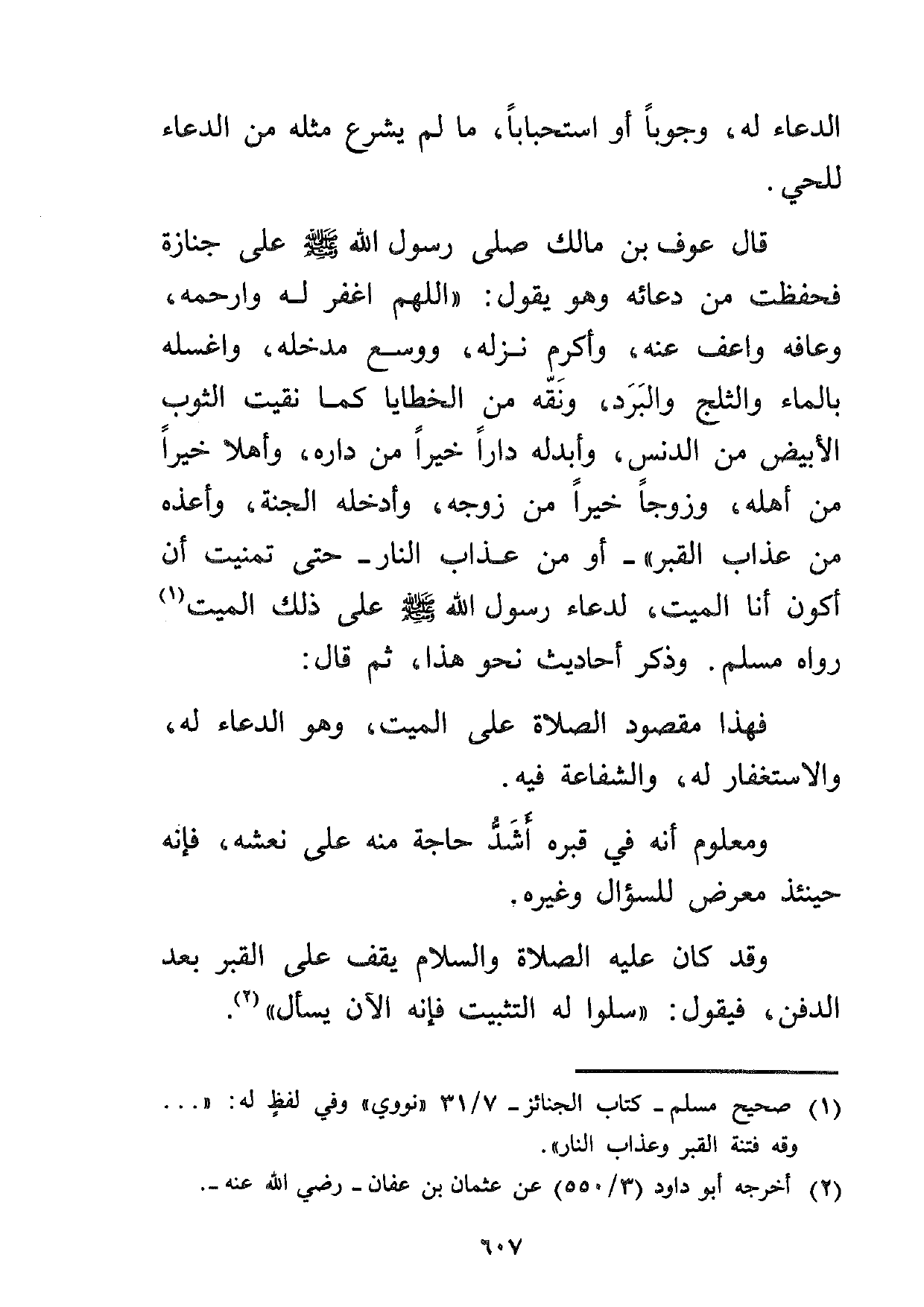 قال عوف بن مالك صلى رسول الله صلى الله عليه وسلم على جنازة فحفظت من دعائه وهو يقول: "اللهم اغفر له وارحمه، وعافه واعف عنه، وأكرم نزله، ووسع مدخله، واغسله بالماء والثلج والبرد، ونقه من الخطايا كما نقيت الثوب الأبيض من الدنس، وأبدله داراً خيراً من داره، وأهلاً خيراً من أهله، وزوجاً خيراً من زوجه، وأدخله الجنة، وأعذه من عذاب القبر" -أو من عذاب النار- حتى تمنيت أن أكون أنا الميت لدعاء رسول الله صلى الله عليه وسلم على ذلك الميت1 رواه مسلم. وذكر أحاديث نحو هذا، ثم قال: