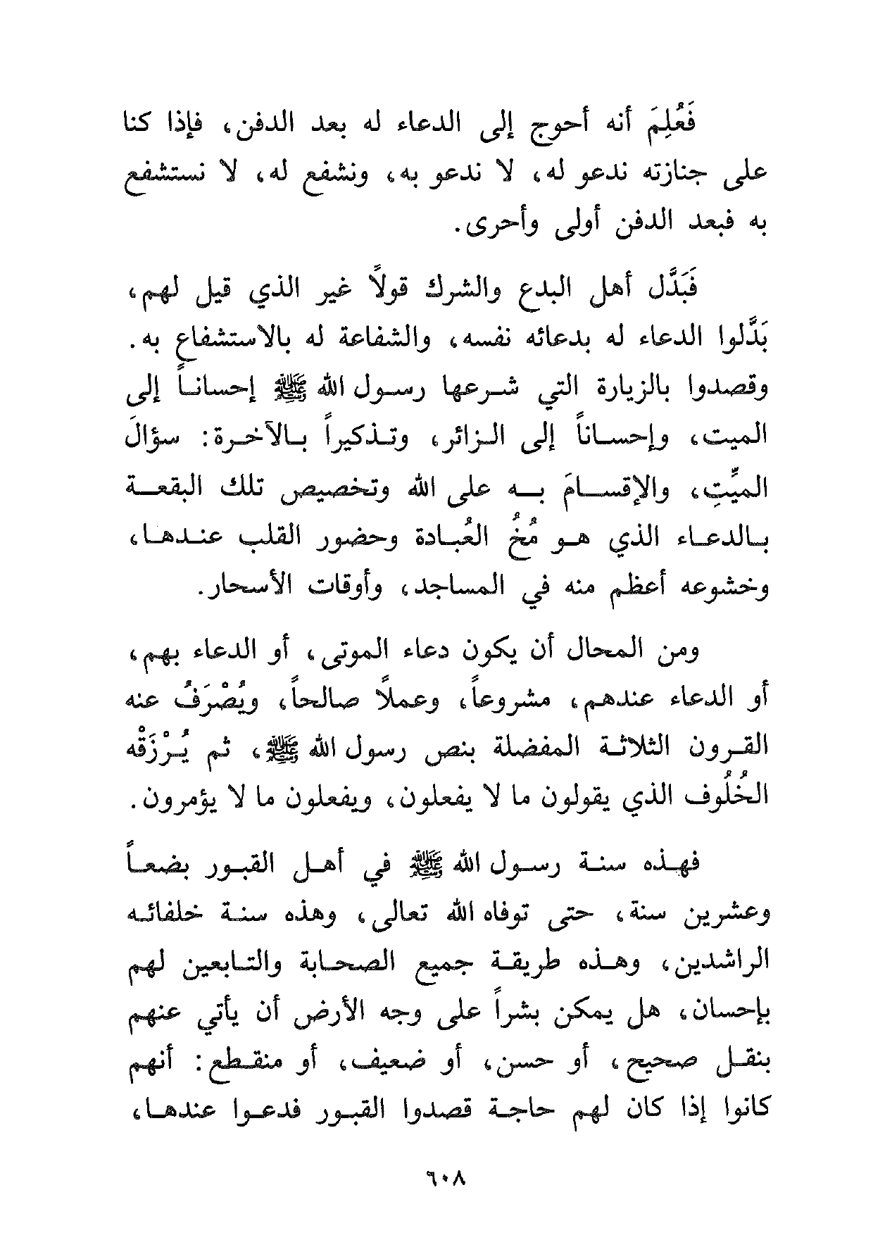ومن المحال أن يكون دعاء الموتى أو الدعاء بهم، أو الدعاء عندهم، مشروعاً وعملاً صالحاً، ويصرف عنه القرون الثلاثة المفضلة بنص رسول الله صلى الله عليه وسلم، ثم يرزقه الخلوف الذي يقولون ما لا يفعلون، ويفعلون ما لا يؤمرون.