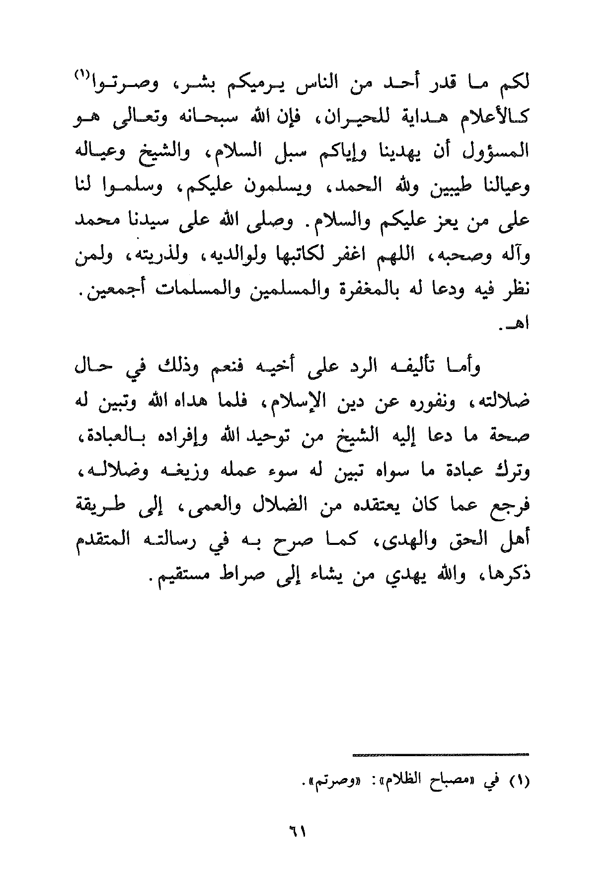 لكم ما قدر أحد من الناس يرميكم بشر، وصرتوا1 كالأعلام هداية للحيران، فإن الله سبحانه وتعالى هو المسؤول أن يهدينا وإياكم سبل السلام، والشيخ وعياله وعيالنا طيبين ولله الحمد، ويسلمون عليكم، وسلموا لنا على من يعز عليكم والسلام، وصلى الله على سيدنا محمد وآله وصحبه، اللهم اغفر لكاتبها ولوالديه ولذريته، ولمن نظر فيه ودعا له بالمغفرة والمسلمين والمسلمات أجمعين اهـ.