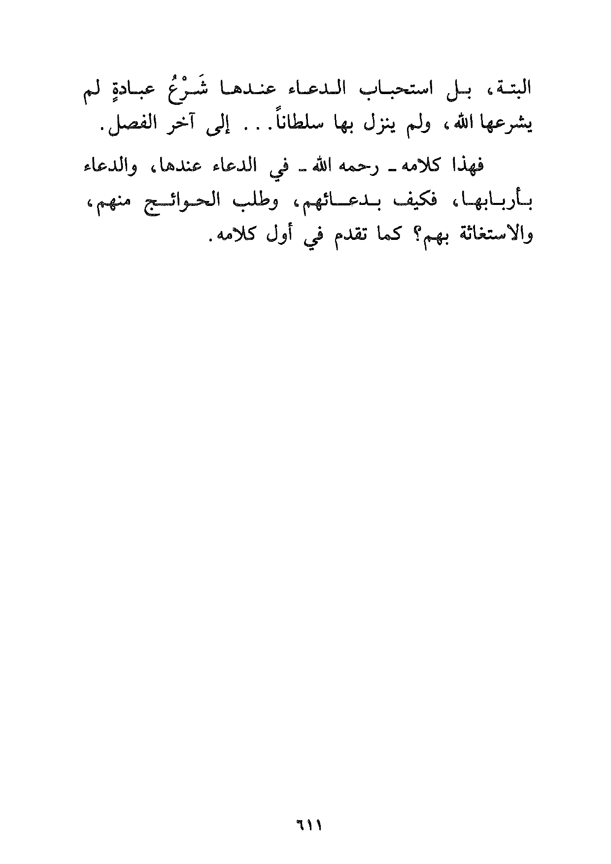 فهذا كلامه رحمه الله في الدعاء عندها، والدعاء بأربابها فكيف بدعائهم، وطلب الحوائج منهم، والاستغاثة بهم؟ كما تقدم في أول كلامه.