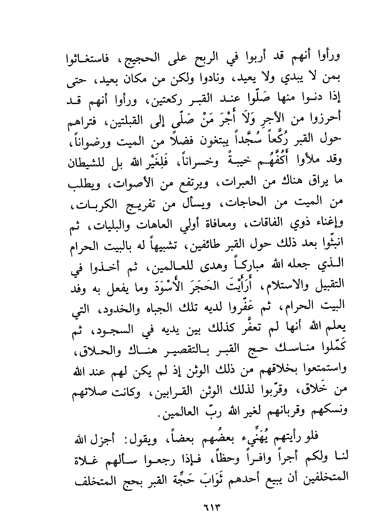 ورأوا أنهم قد أربوا في الربح على الحجيج، فاستغاثوا بمن لا يبدي ولا يعيد، ونادوا ولكن من مكان بعيد، حتى إذا دنوا منها صلوا عند القبر ركعتين، ورأوا أنهم قد أحرزوا من الأجر ولا أجر من صلى إلى القبلتين، فتراهم حول القبر ركعاً سجداً يبتغون فضلاً من الميت ورضواناً، وقد ملأوا أكفهم خيبة وخسراناً، فلغير الله بل للشيطان ما يراق هناك من العبرات، ويرتفع من الأصوات، ويطلب من الميت من الحاجات، ويسأل من تفريج الكربات، وإغناء ذوي الفاقات، ومعافاة أولي العاهات والبليات، ثم انبثوا بعد ذلك حول القبر طائفين، تشبيها له بالبيت الحرام الذي جعله الله مباركاً وهدى للعالمين، ثم أخذوا في التقبيل والاستلام، أرأيت الحجر الأسود وما يفعل به وفد البيت الحرام، ثم عفروا لديه تلك الجباه والخدود، التي يعلم الله أنها لم تعفر كذلك بين يديه في السجود، ثم كملوا مناسك حج القبر بالتقصير هناك والحلاق، واستمتعوا بخلاقهم من ذلك الوثن إذ لم يكن لهم عند الله من خلاق، وقربوا لذلك الوثن القرابين، وكانت صلاتهم ونسكهم وقربانهم لغير الله رب العالمين.