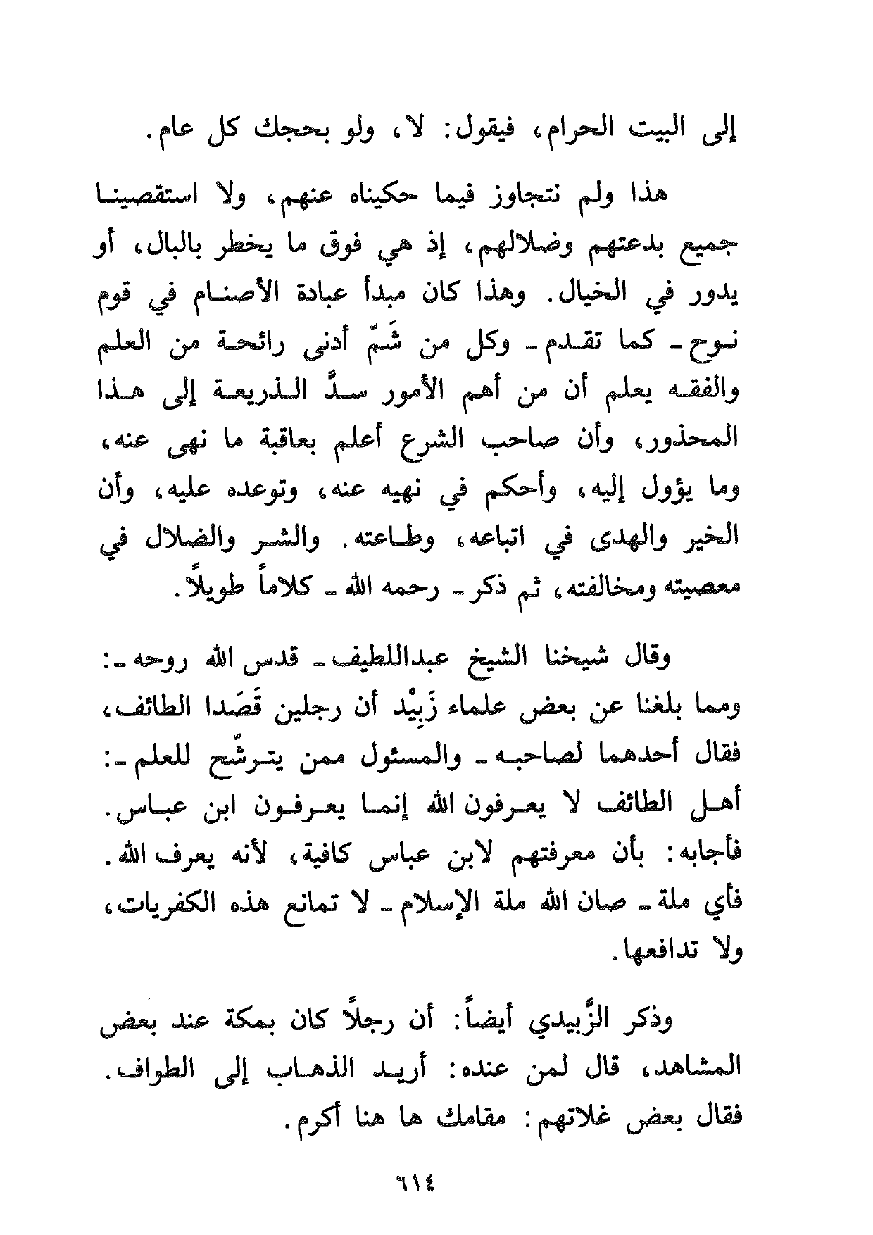 وقال شيخنا الشيخ عبد اللطيف -قدس الله روحه-: ومما بلغنا عن بعض علماء زبيد أن رجلين قصدا الطائف، فقال أحدهما لصاحبه -والمسئول ممن يترشح للعلم-: أهل الطائف لا يعرفون الله إنما يعرفون ابن عباس، فأجابه: بأن معرفتهم لابن عباس كافية، لأنه يعرف الله. فأي ملة -صان الله ملة الإسلام- لا تمانع هذه الكفريات، ولا تدافعها.