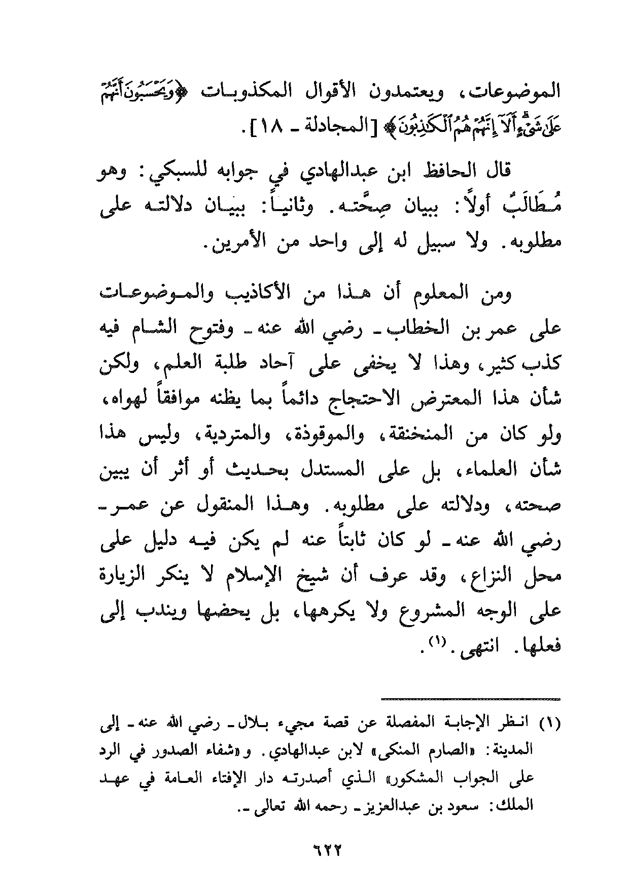 ومن المعلوم أن هذا من الأكاذيب والموضوعات على عمر بن الخطاب رضي الله عنه، وفتوح الشام فيه كذب كثير، وهذا لا يخفى على آحاد طلبة العلم، ولكن شأن هذا المعترض الاحتجاج دائماً بما يظنه موافقاً لهواه، ولو كان من المنخنقة، والموقوذة، والمتردية، وليس هذا شأن العلماء، بل على المستدل بحديث أو أثر أن يبين صحته، ودلالته على مطلوبه، وهذا المنقول عن عمر رضي الله عنه لو كان ثابتاً عنه لم يكن فيه دليل على محل النزاع، وقد عرف أن شيخ الإسلام لا ينكر الزيارة على الوجه المشروع ولا يكرهها، بل يحضها ويندب إلى فعلها. انتهى1.
