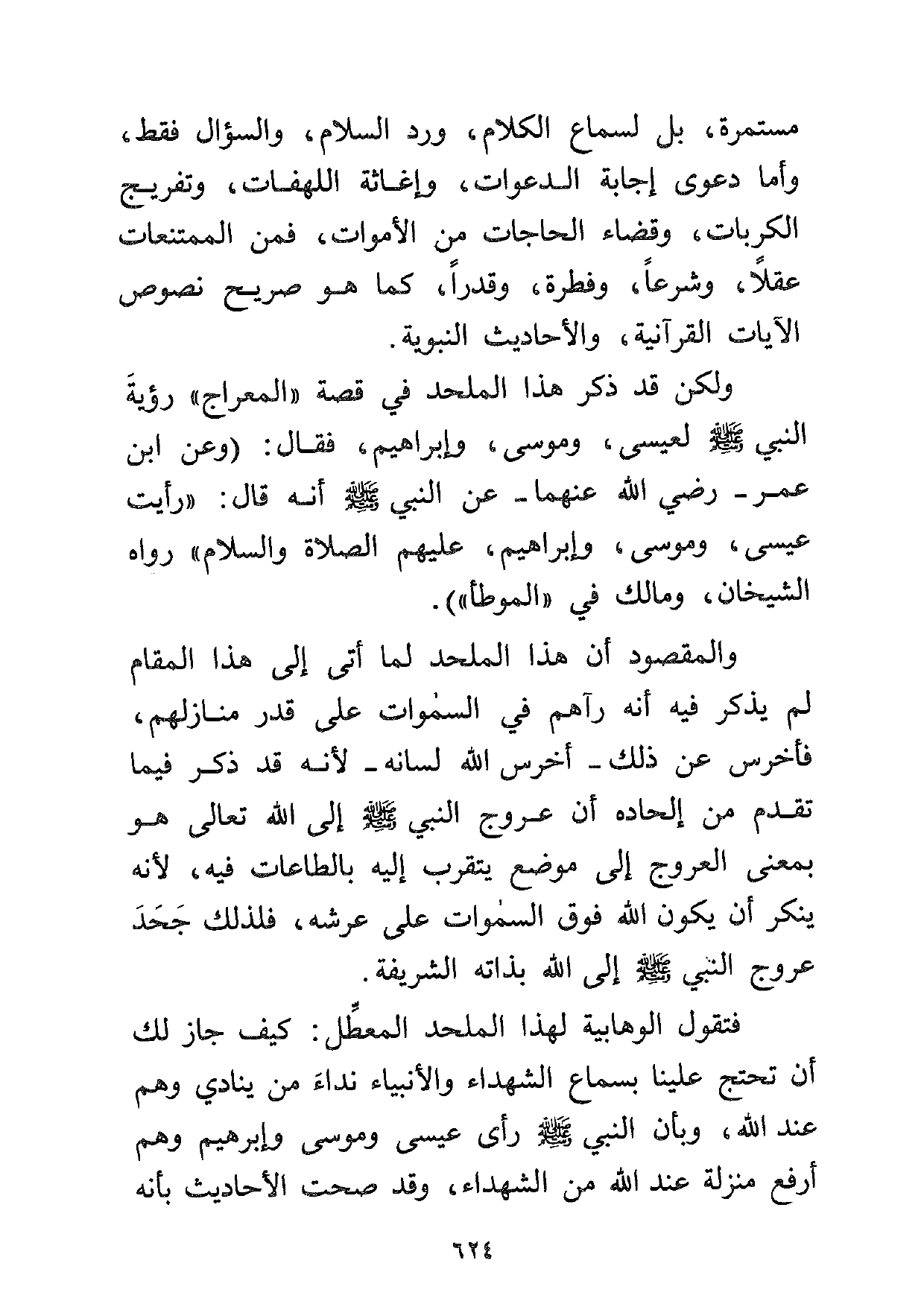 فتقول الوهابية لهذا الملحد المعطل: كيف جاز لك ذلك أن تحتج علينا بسماع الشهداء والأنبياء نداء من ينادي وهم عند الله، وبأن النبي صلى الله عليه وسلم رأى عيسى وموسى وإبراهيم وهم أرفع منزلة عند الله من الشهداء، وقد صحت الأحاديث بأنه