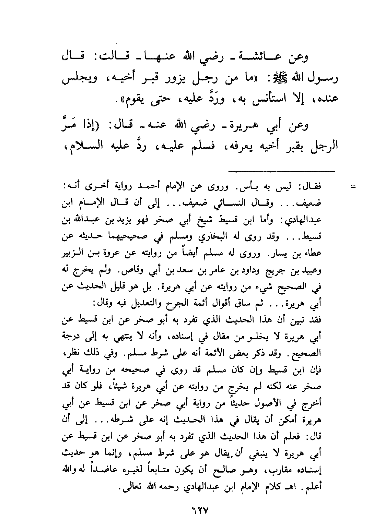 وعن عائشة رضي الله عنها قالت: قال رسول الله صلى الله عليه وسلم: " ما من رجل يزور قبر أخيه، ويجلس عنده، إلا استأنس به، ورد عليه حتى يقوم".