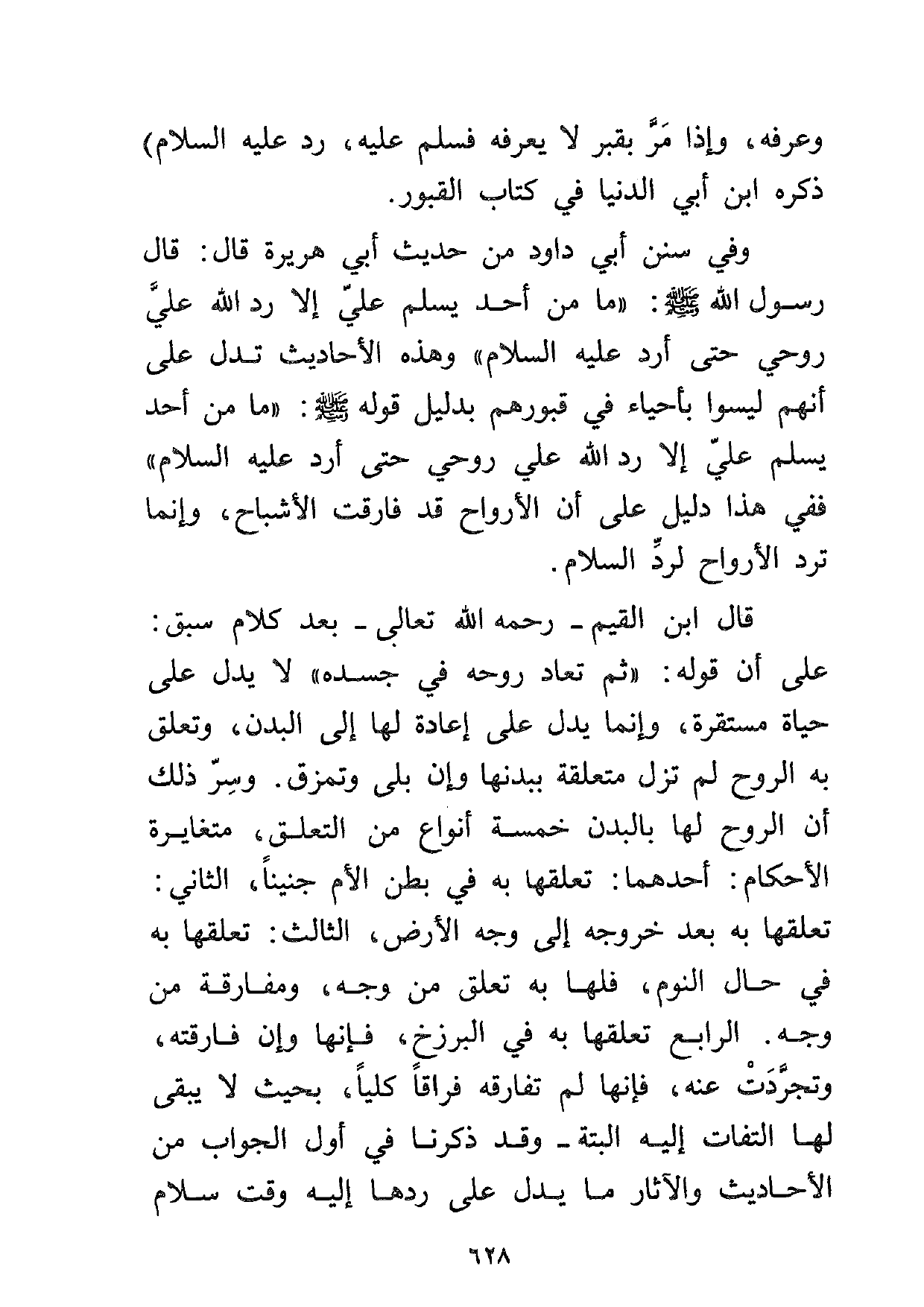 قال ابن القيم رحمه الله تعالى بعد كلام سبق: على أن قوله: "ثم تعاد روحه في جسده" لا يدل على حياة مستقرة، وإنما يدل على إعادة لها إلى البدن، وتعلق به الروح لم تزل متعلقة ببدنها وإن بلى وتمزق. وسر ذلك أن الروح لها بالبدن خمسة أنواع من التعلق، متغايرة الأحكام: أحدهما تعلقها به في بطن الأم جنيناً، الثاني: تعلقها به بعد خروجه إلى وجه الأرض، الثالث: تعلقها به في حال النوم، فلها به تعلق من وجه، ومفارقة من وجه. الرابع تعلقها به في البرزخ، فإنها وإن فارقته، وتجردت عنه، فإنها لم تفارقه فراقاً كلياً، بحيث لا يبقى لها التفات إليه ألبتة –وقد ذكرنا في أول الجواب من الأحاديث والآثار ما يدل على ردها إليه وقت سلام