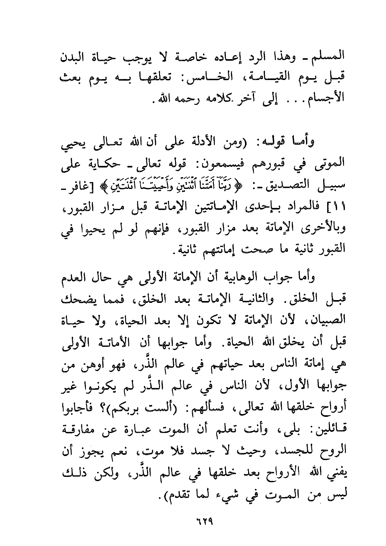 المسلم- وهذا الرد إعادة خاصة لا يوجب حياة البدن إلى قبل يوم القيامة، الخامس: تعلقها به يوم بعث الأجسام ... إلى آخر كلامه رحمه الله.