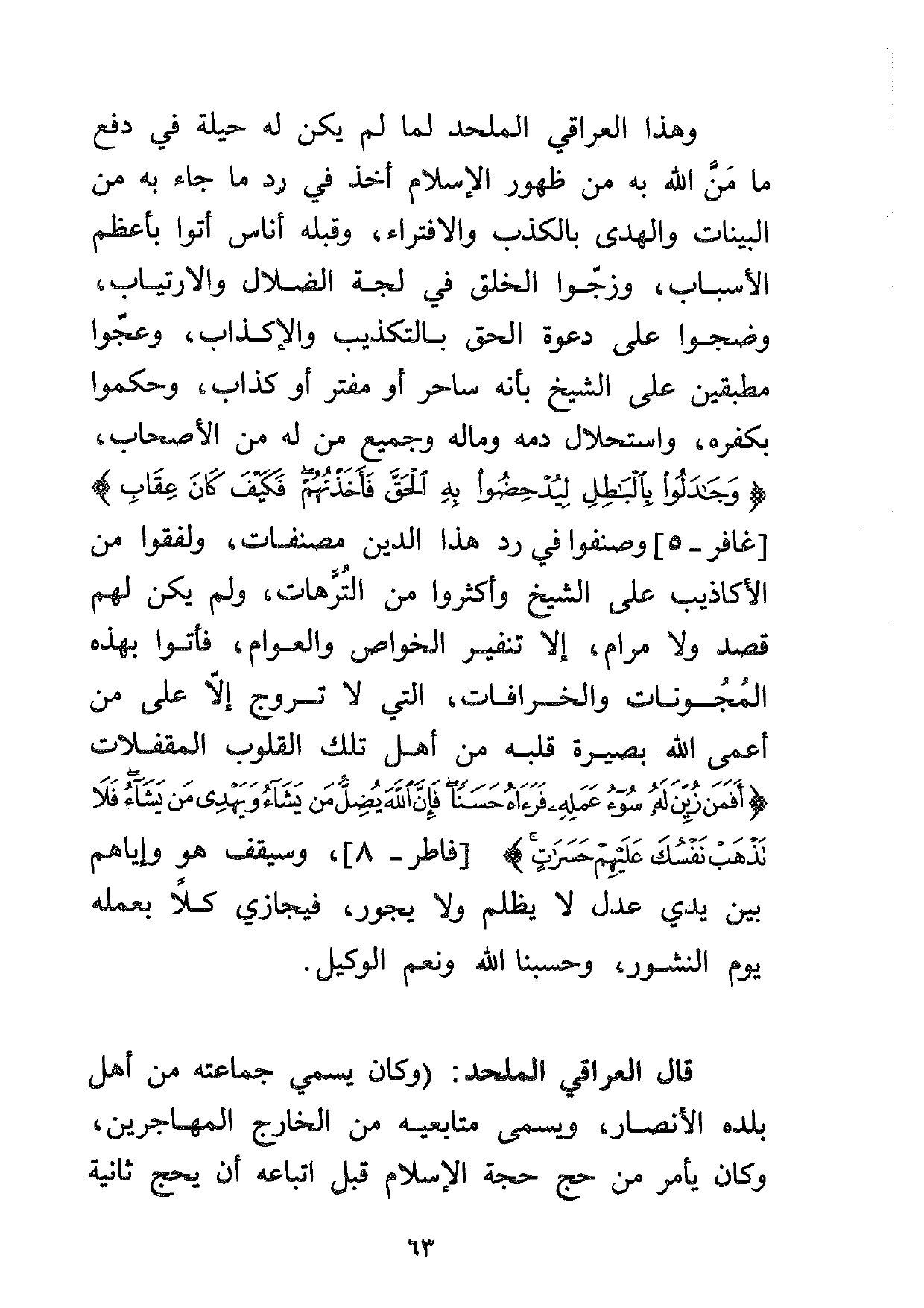 وهذا العراقي الملحد لما لم يكن له حيلة في دفع ما منّ الله به من ظهور الإسلام أخذ في رد ما جاء به من البينات والهدى بالكذب والافتراء، وقبله أناس أتوا بأعظم الأسباب، وزجوا الخلق في لجة الضلال والارتياب، وضجوا على دعوة الحق بالتكذيب والإكذاب، وعجوا مطبقين على الشيخ بأنه ساحر أو مفتر أو كذاب، وحكموا بكفره، واستحلال دمه وماله وجميع من له من الأصحاب، {وَجَادَلُوا بِالْبَاطِلِ لِيُدْحِضُوا بِهِ الْحَقَّ فَأَخَذْتُهُمْ فَكَيْفَ كَانَ عِقَابِ} [غافر:5] وصنفوا في رد هذا الدين مصنفات، ولفقوا من الأكاذيب على الشيخ وأكثروا من الترهات، ولم يكن لهم قصد ولا مرام، إلا تنفير الخواص والعوام، فأتوا بهذه المجونات والخرافات التي لا تروج إلا على من أعمى الله بصيرة قلبه من أهل تلك القلوب المقفلات {أَفَمَنْ زُيِّنَ لَهُ سُوءُ عَمَلِهِ فَرَآهُ حَسَناً فَإِنَّ اللَّهَ يُضِلُّ مَنْ يَشَاءُ وَيَهْدِي مَنْ يَشَاءُ فَلا تَذْهَبْ نَفْسُكَ عَلَيْهِمْ حَسَرَات} [فاطر: 8] ، وسيقف هو وإياهم بين يدي عدل لا يظلم ولا يجور، فيجازي كلاً بعمله يوم النشور، وحسبنا الله ونعم الوكيل.