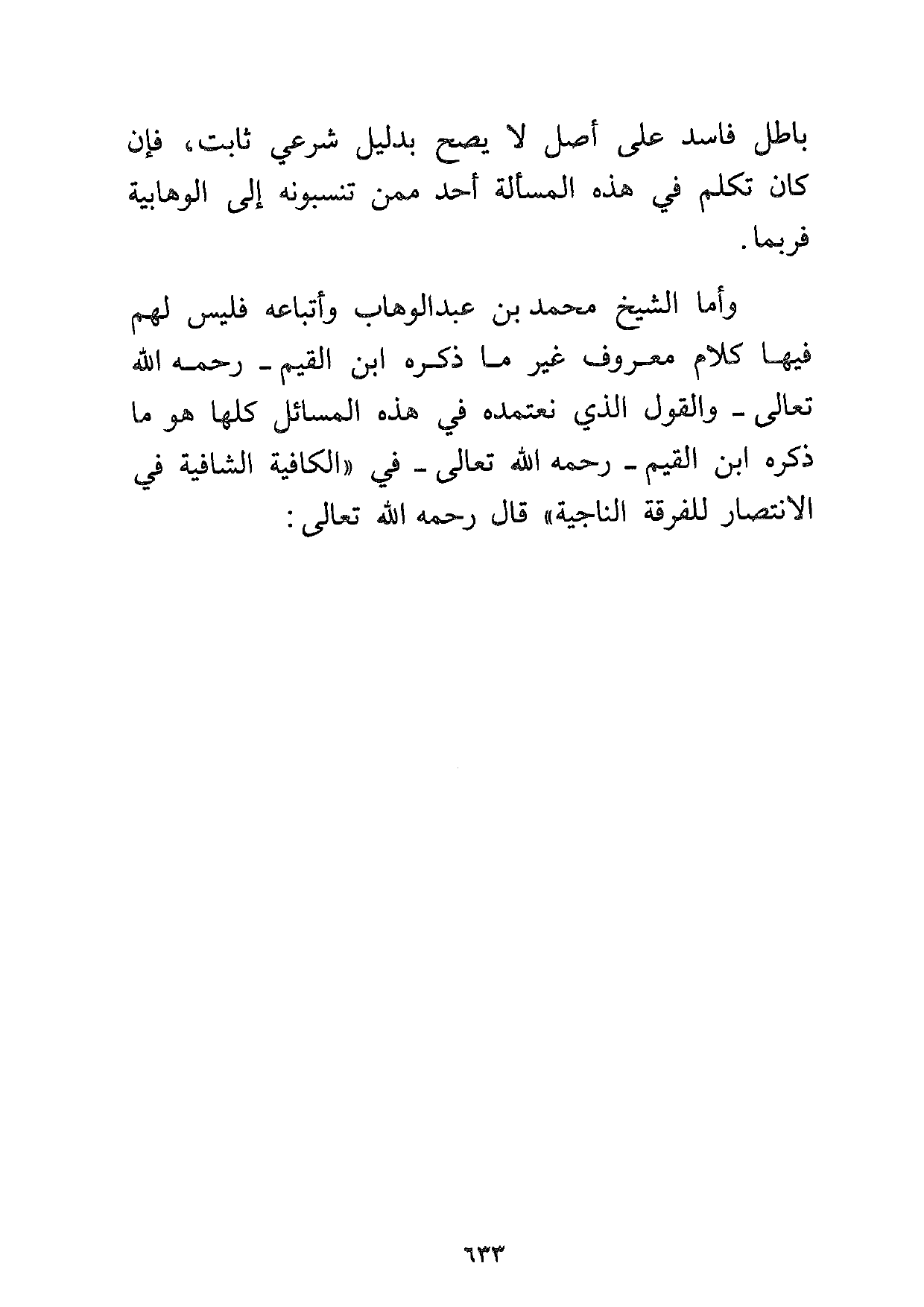 وأما الشيخ محمد بن عبد الوهاب وأتباعه فليس لهم فيها كلام معروف، غير ما ذكره ابن القيم رحمه الله تعالى، والقول الذي نعتمده في هذه المسائل كلها هو ما ذكره ابن القيم رحمه الله تعالى في "الكافية الشافية في الانتصار للفرقة الناجية" قال رحمه الله تعالى: