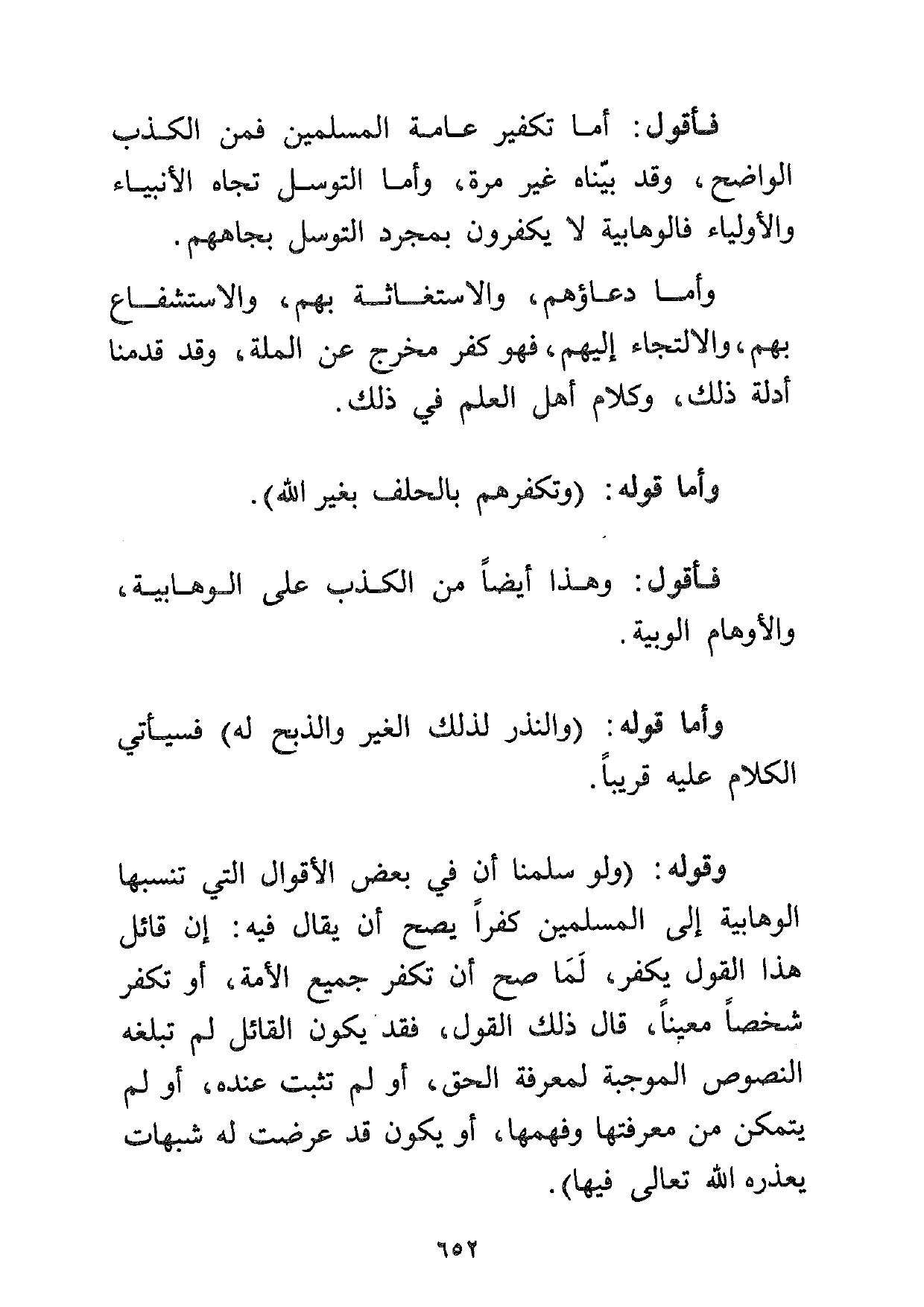 وقوله: (ولو سلمنا أن في بعض الأقوال التي تنسبها الوهابية إلى المسلمين كفراً يصح أن يقال فيه: إن قائل هذا القول يكفر، لما صح أن تكفر جميع الأمة، أو تكفر شخصاً معيناً، قال ذلك القول، فقد يكون القائل لم تبلغه النصوص الموجبة لمعرفة الحق، أو لم تثبت عنده، أو لم يتمكن من معرفتها وفهمها، أو يكون قد عرضت له شبهات يعذره الله تعالى فيها) .