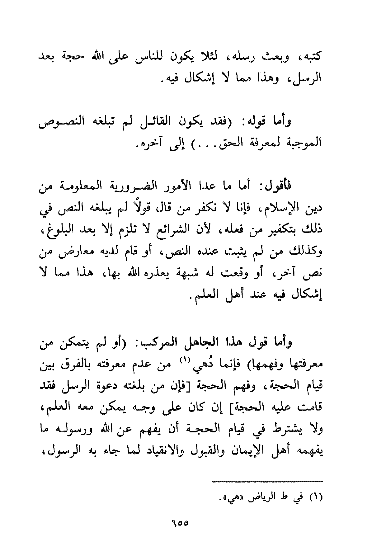 فأقول: أما ما عدا الأمور الضرورية المعلومة من دين الإسلام، فإنا لا نكفر من قال قولاً لم يبلغه النص في ذلك بتكفير من فعله، لأن الشرائع لا تلزم إلا بعد البلوغ، وكذلك من لم يثبت عنده النص، أو قام لديه معارض من نص آخر، أو وقعت له شبهة يعذره الله بها، هذا مما لا إشكال فيه عند أهل العلم.